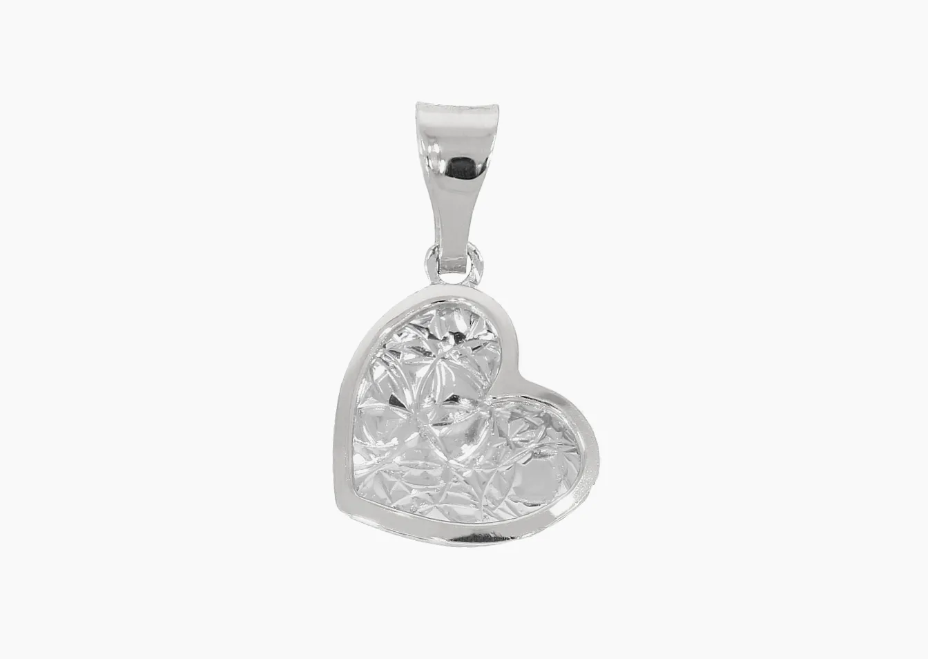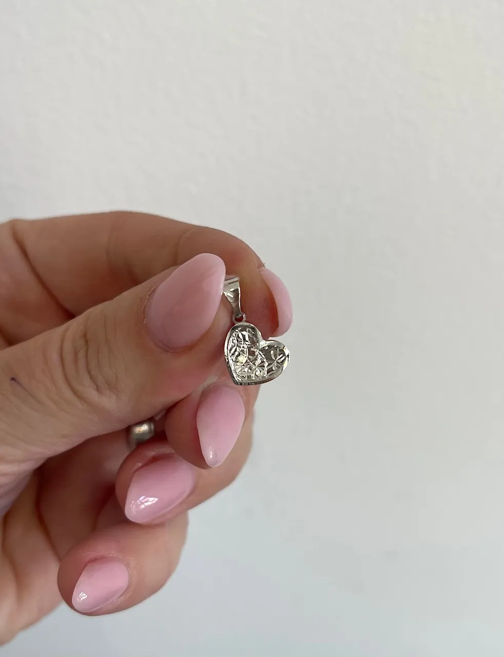 Krásne moderné srdiečko vyrobené z bieleho 14k zlata s lesklou povrchovou úpravou je zdobené gravírovaným vzorom.
