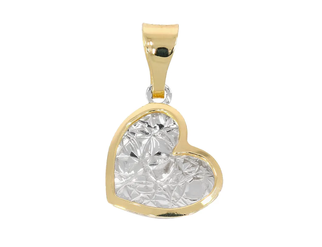 Zlatý prívesok vyrobený v tvare moderného srdiečka zdobí uprostred biele zlato a gravírovaný vzor, kraje šperku sú vyrobené zo hladkého, lesklého žltého zlata.