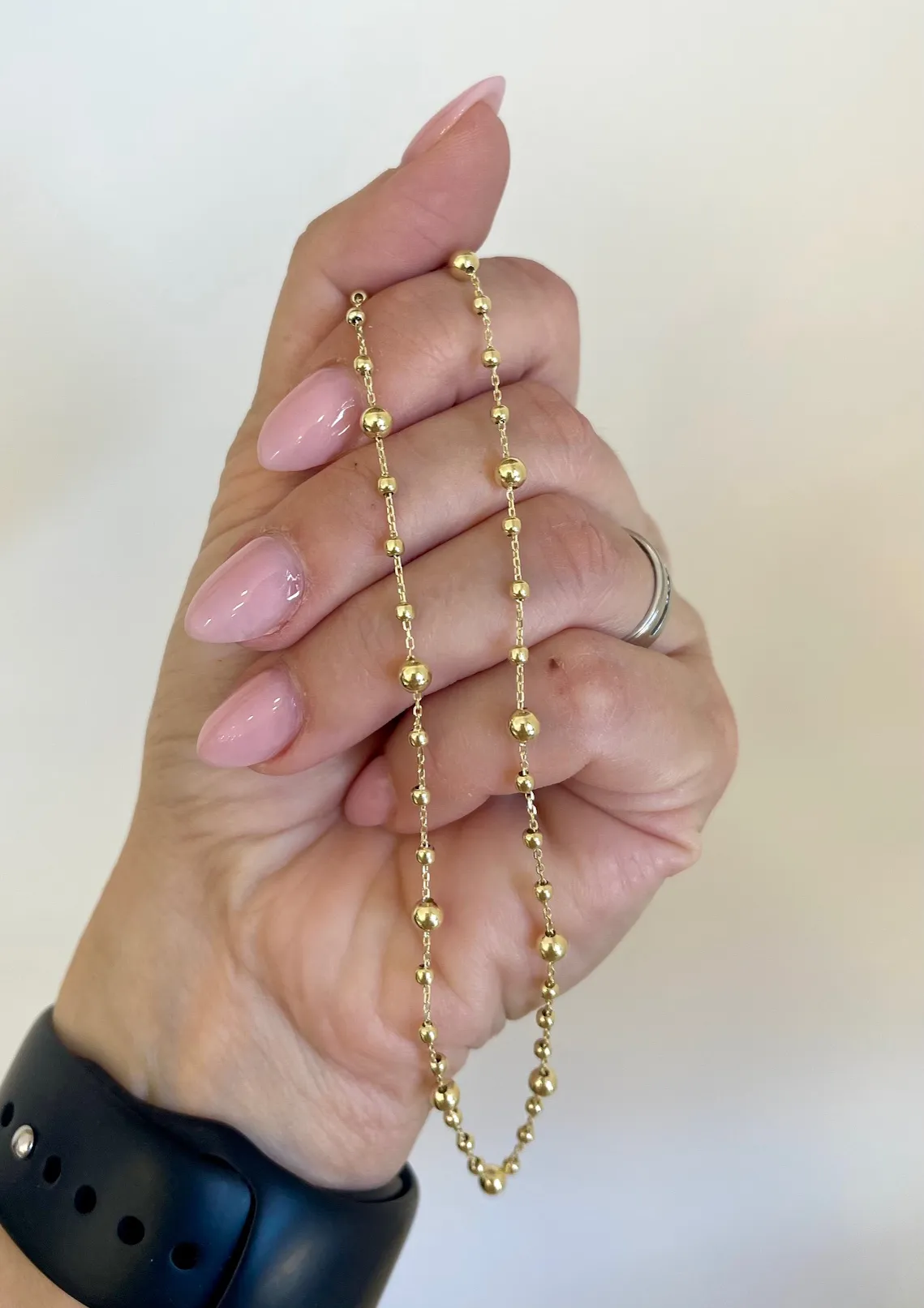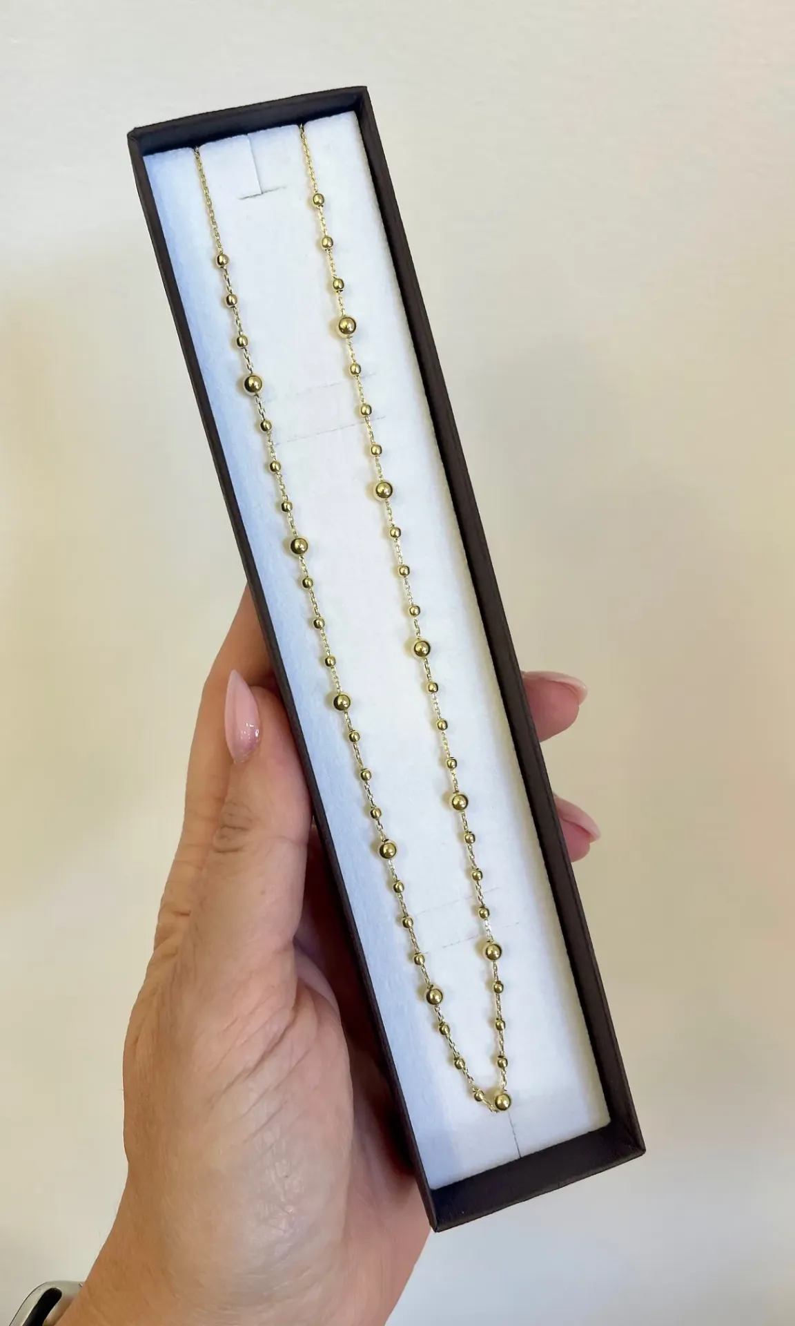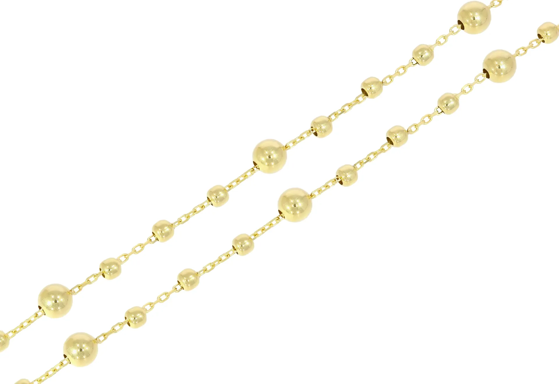 Pekná zlatá retiazka zdobená pravidelným striedaním jednej väčšej guľky s priemerom 4mm a troch menších guliek s priemerom 2mm. Guľky dekorujú retiazku po celej dĺžke. Retiazka má lesklú, hladkú povrchovú úpravu a je vhodná aj ako darček. Dĺžka šperku je regulovateľná v rozmedzí 5cm a zapínanie má tvar pérového krúžku. Spolu so Zlatým náramkom 1376 tvoria krásnu súpravu.