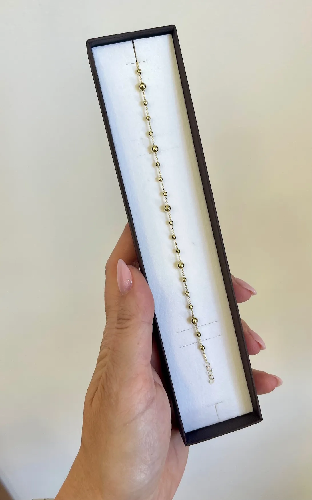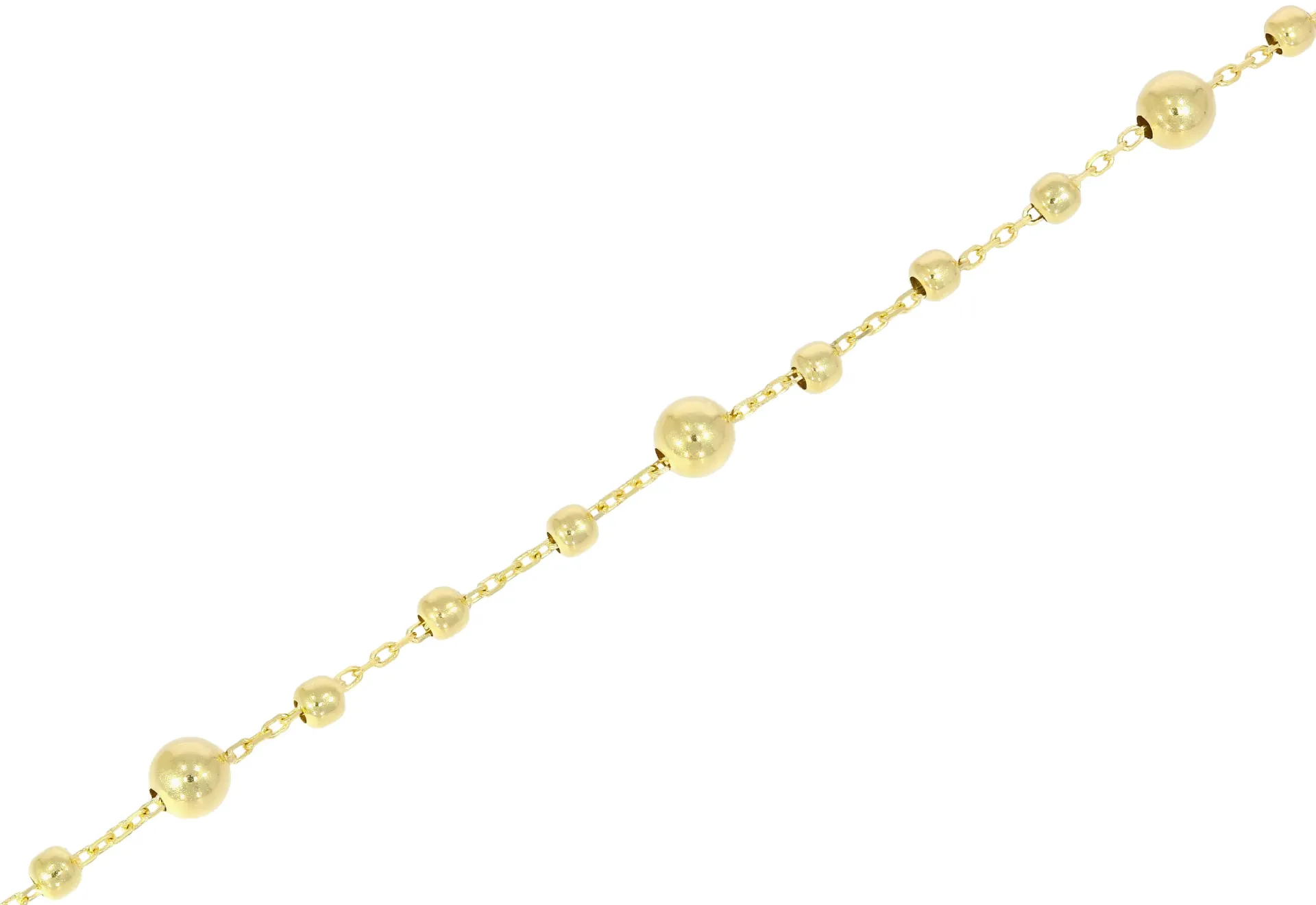 Pekný zlatý náramok dekorovanými väčšímu guľkami s priemerom 4mm a menšími s priemerom 2mm. Náramok má lesklú povrchovú úpravu a zapínanie v tvare pérového krúžku. Dĺžka je regulovateľná v rozmedzí 1cm. Spolu so Zlatou retiazkou 1412 tvoria krásnu súpravu.