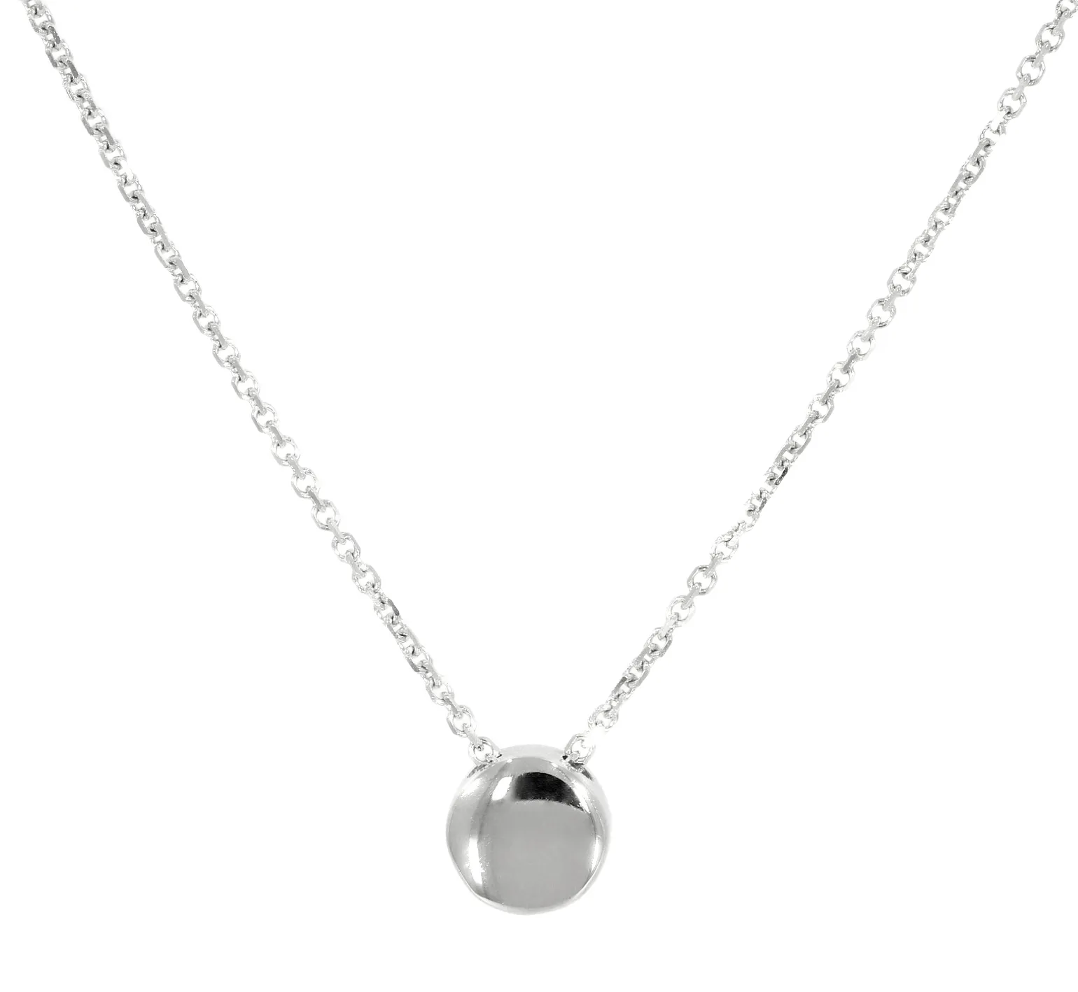 Jednoduchá retiazka vyrobená z bieleho zlata zdobená minimalistickým príveskom s priemerom 5mm. Prívesok má hladkú, lesklú povrchovú úpravu. Dĺžka retiazky je nastaviteľná na 39cm alebo 42cm. Zapínanie má tvar pérového krúžku.