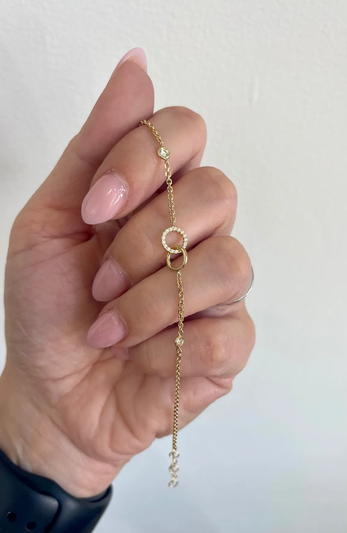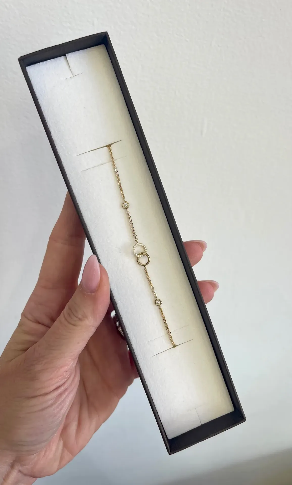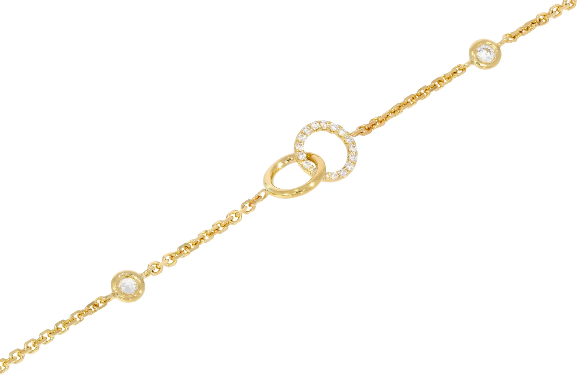 Zlatý náramok zdobí skutočne obľúbený motív v podobe dvoch prepletených kruhov (s priemerom 7mm). Jeden kruh dekorujú biele zirkóny, zatiaľ čo druhý je hladký, lesklý. Dva biele zirkóny s priemerom 4mm dotvárajú celkový dizajn šperku. Náramok je vyrobený zo žltého 14k zlata a jeho dĺžka je nastaviteľná v rozpätí 2cm. Zapínanie má tvar bezpečnej karabínky. Spolu so Zlatou retiazkou 1188 tvoria krásnu súpravu.
