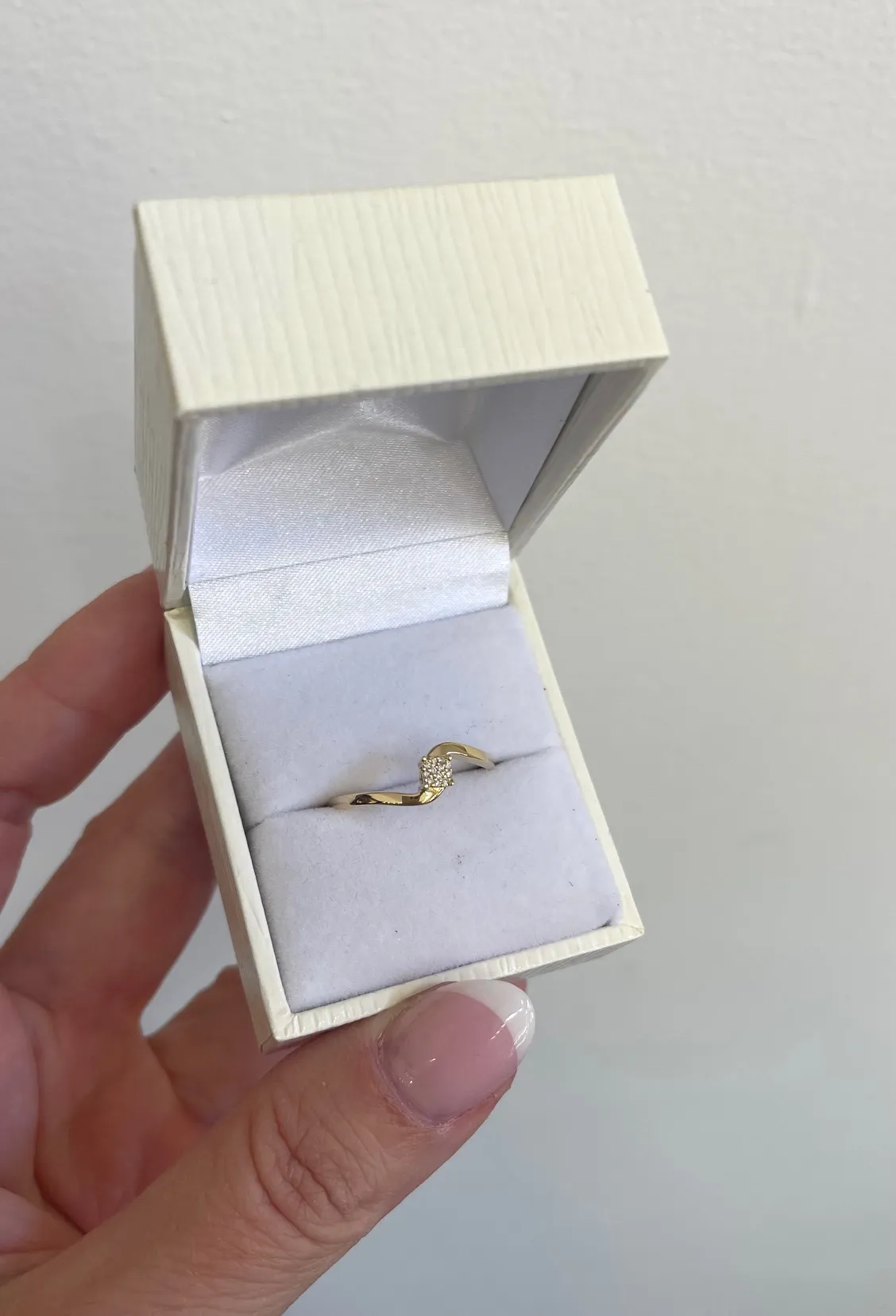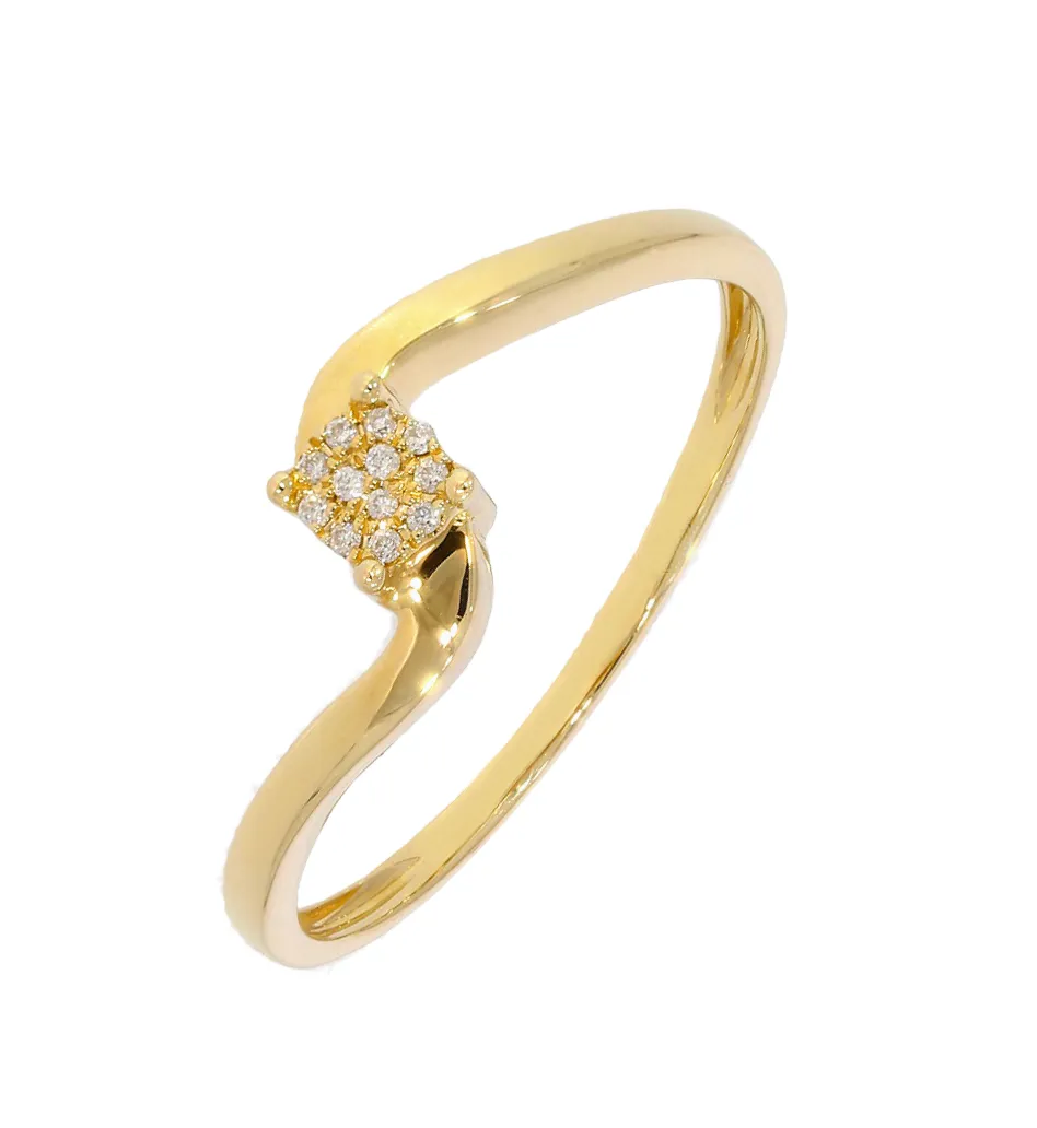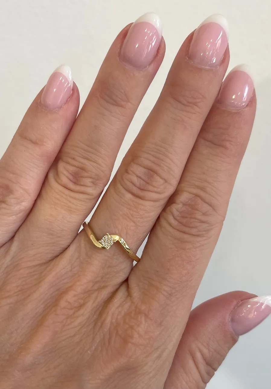 Krásny zlatý prsteň vyrobený zo žltého 14k zlata je zdobený diamantmi 0,023ct. Pravosť prírodných dimantov potvrdzuje certifikát, ktorý je súčasťou šperku.