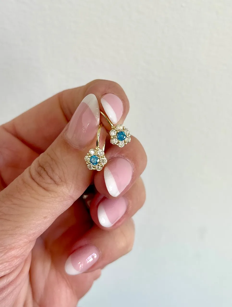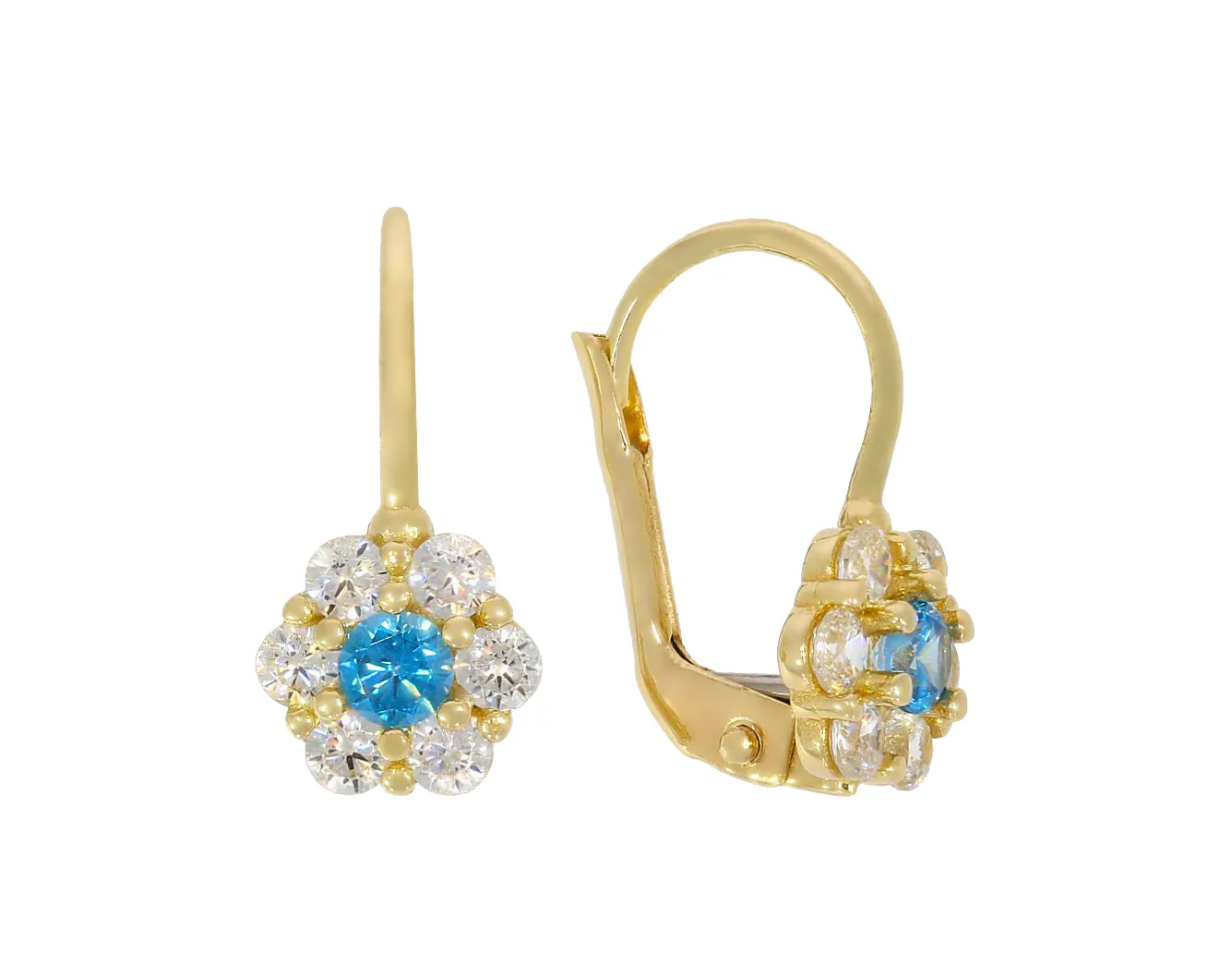 Krásne zlaté náušnice zdobí kvetinka, ktorej stred zdobí belasý zirkón. Biele zirkóny uchytené po jeho obvode vytvárajú lupienky kvetu. Náušnice sú vyrobené zo žltého 14k zlata a sú vhodné pre dievčatá alebo dámy s menšími ušnými lalokmi.