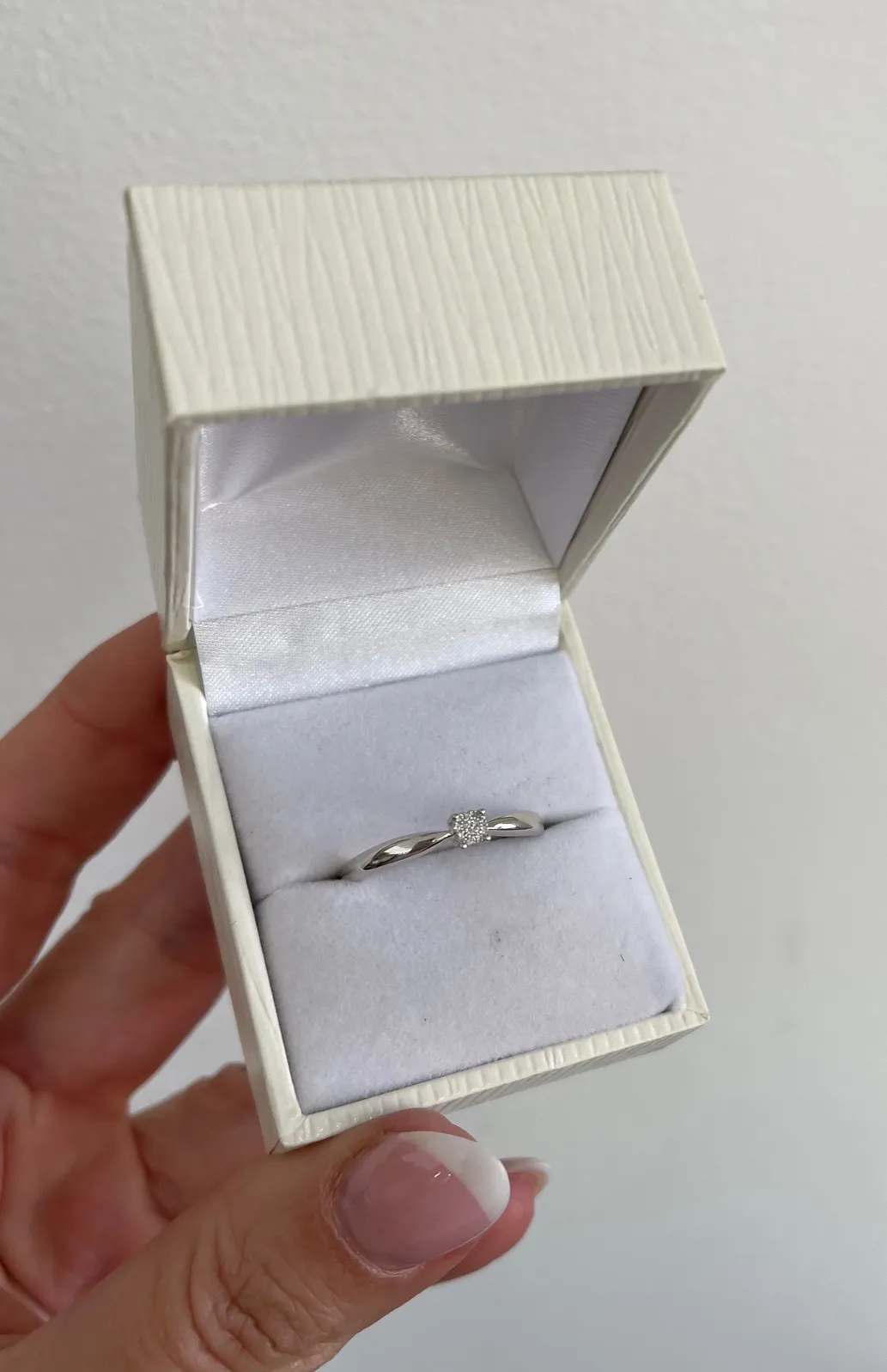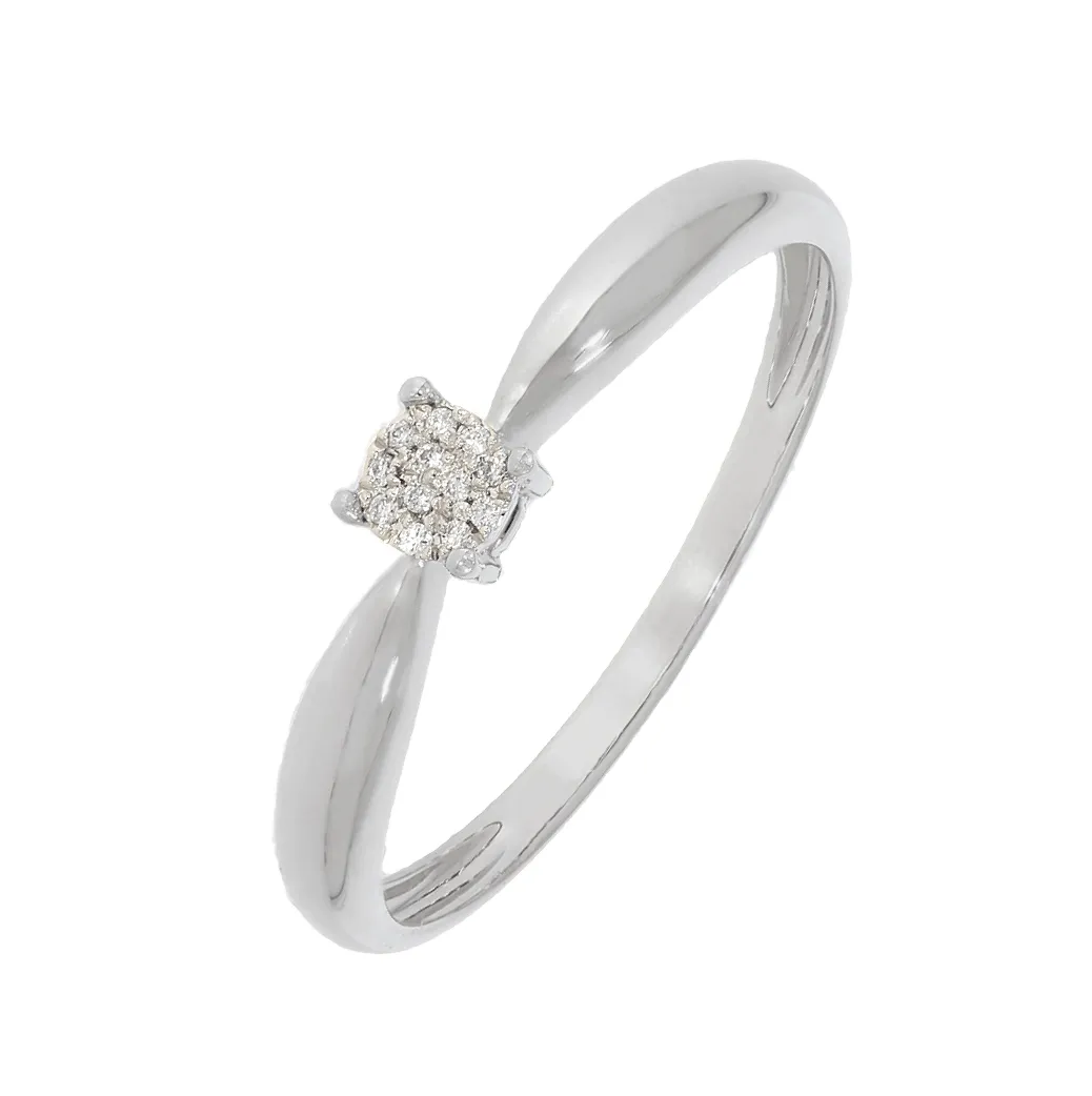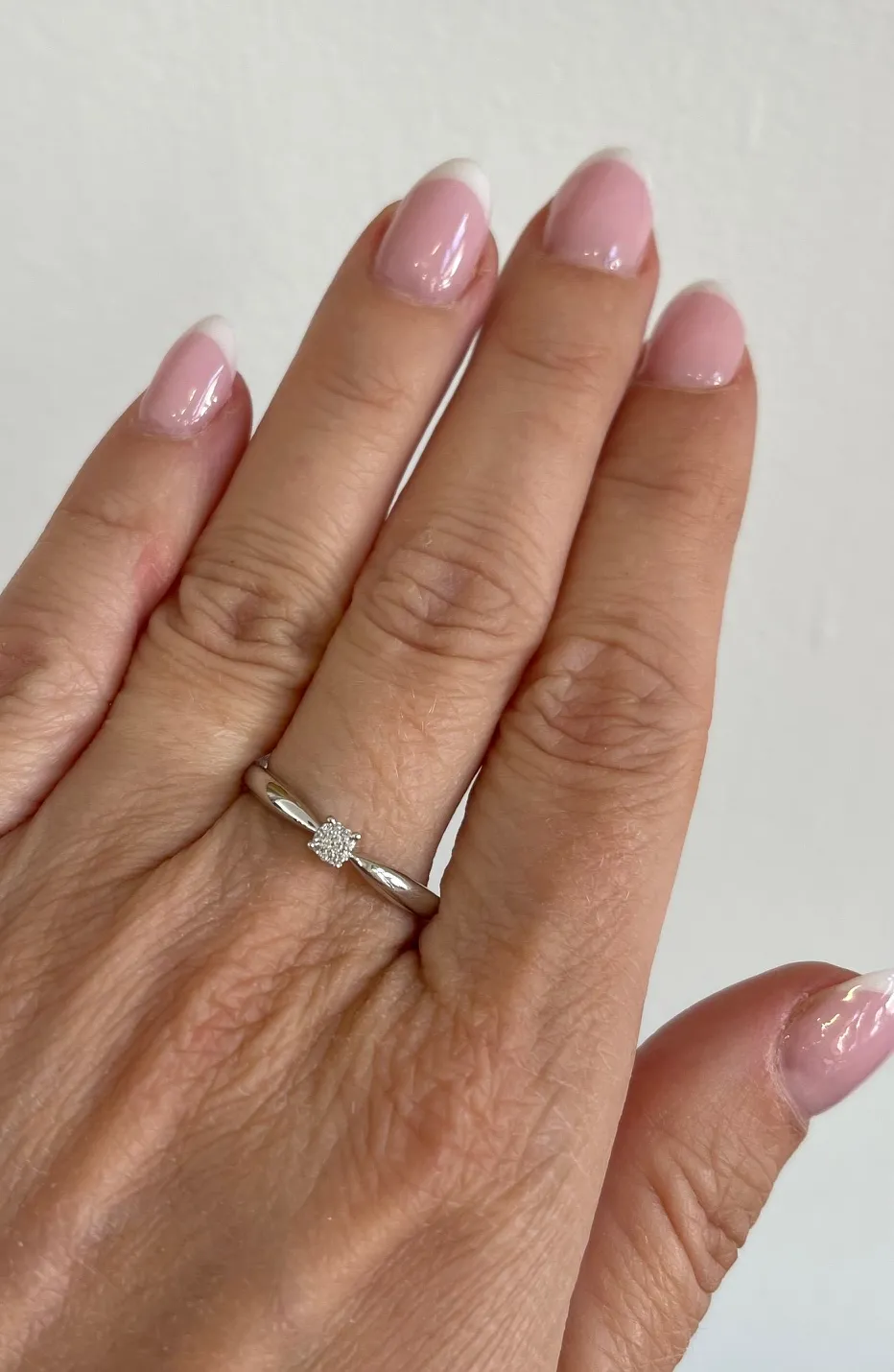 Krásny diamantový prsteň z bieleho 14 karátového zlata. Prsteň zdobia prírodné diamanty 0,023ct, ich pravosť potvrdzuje certifikát.
