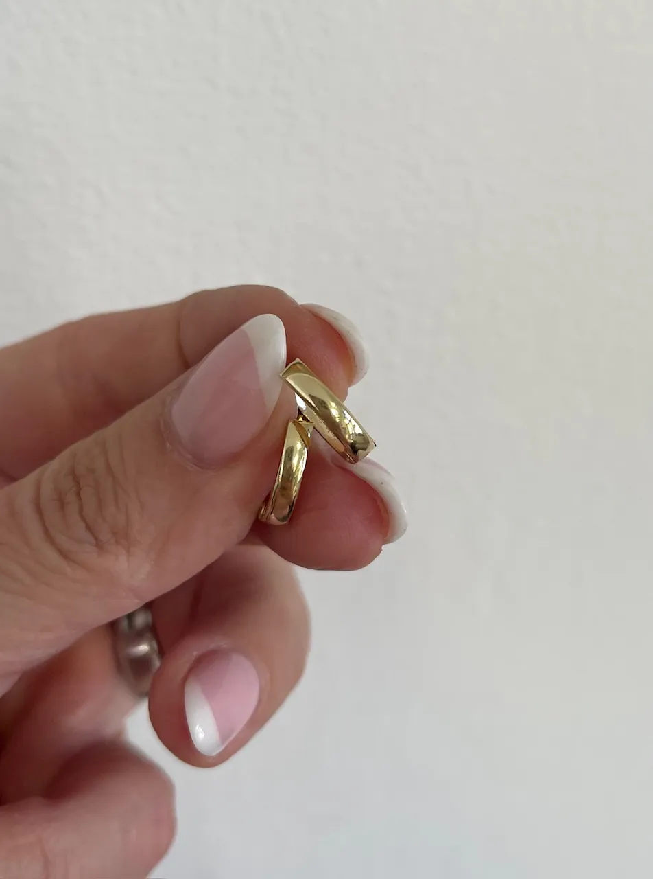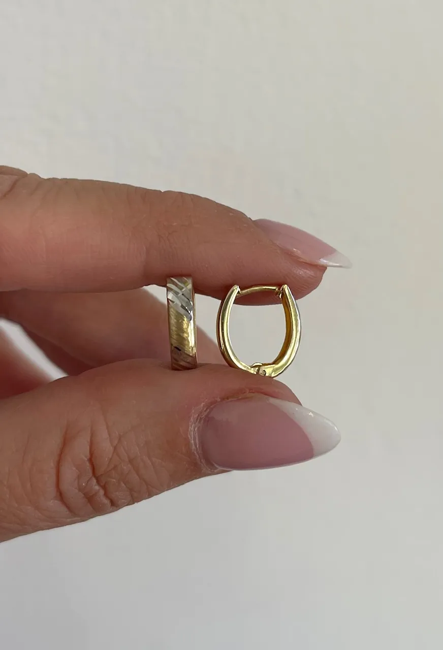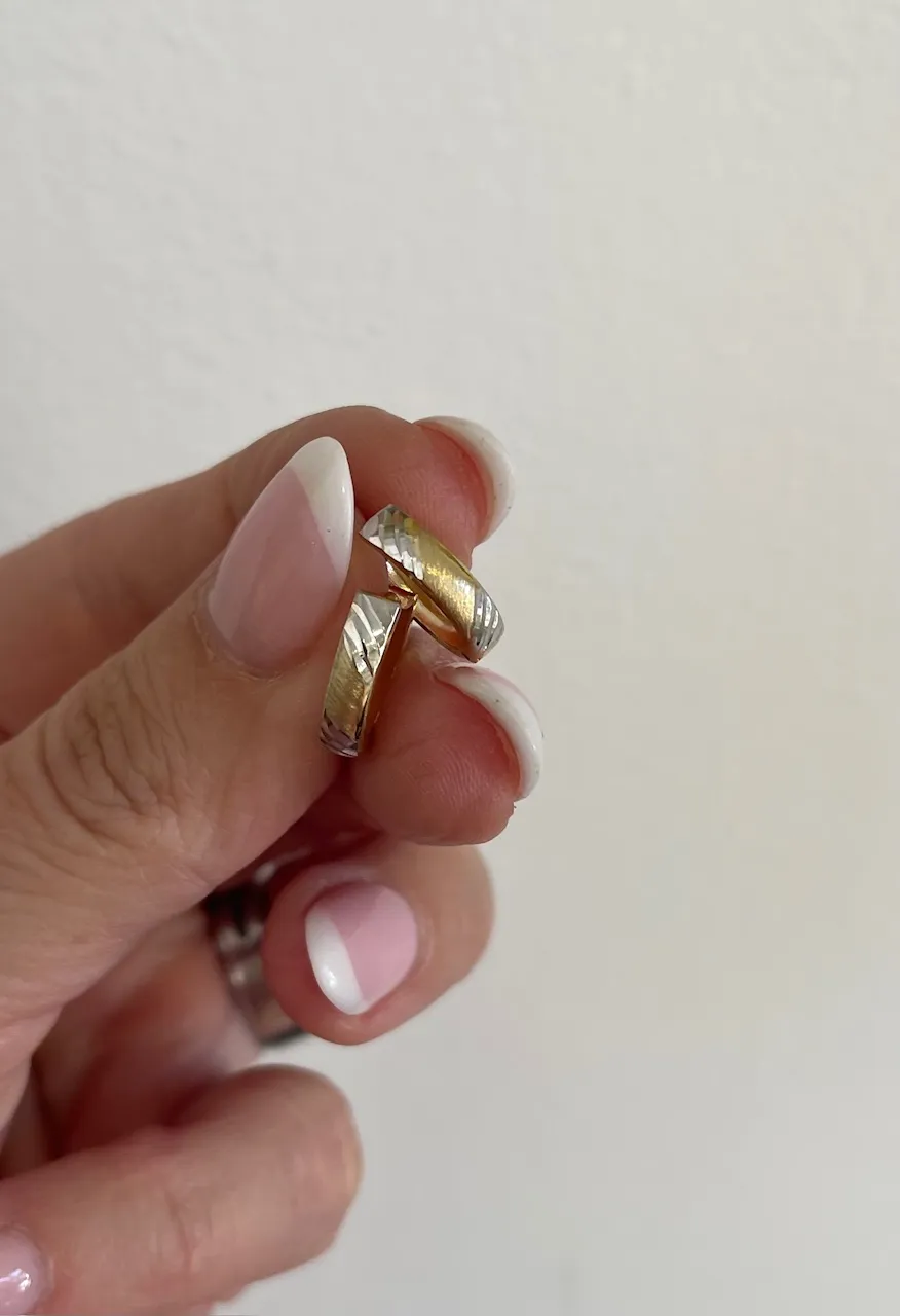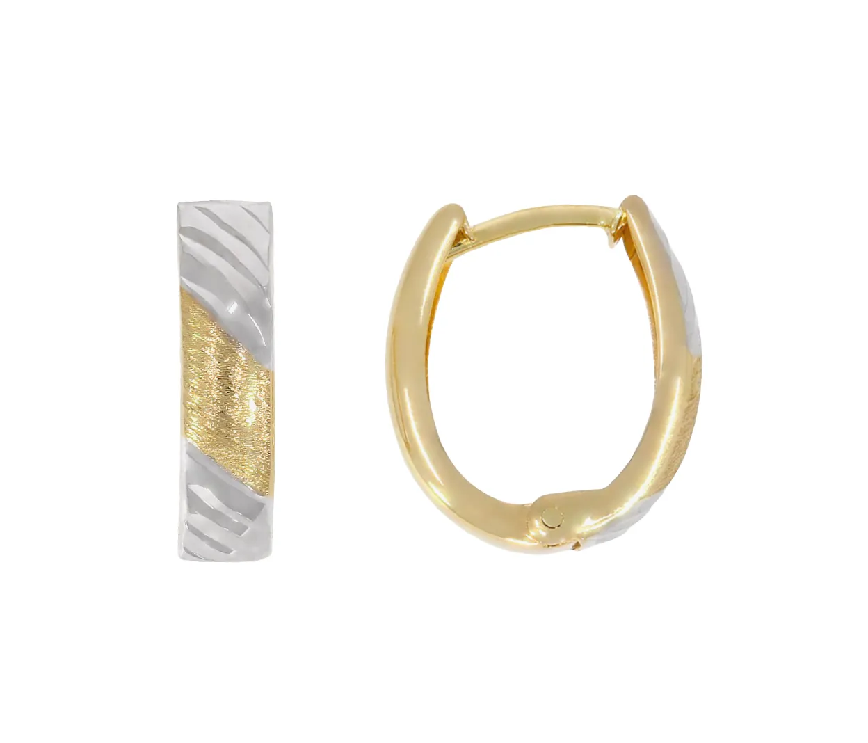 Zlaté náušničky vyrobené v tvare mierne predĺžených krúžkov sú z prednej strany zdobené bielym tónovaním zlata a gravírovaným vzorom. Zadná strana šperku je hladká, lesklá, náušnice je teda možné nosiť obojstranne. Svojou veľkosťou sú vhodné pre dievčatá alebo dámy s menšími ušnými lalokmi.