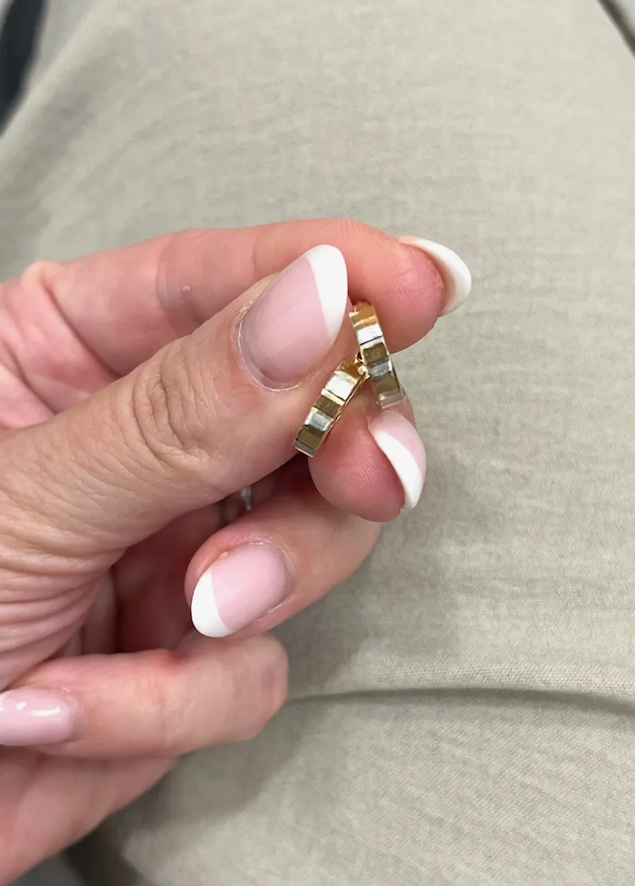 Pekné zlaté náušničky vyrobené zo žltého 14k zlata. Prednú stranu zdobí biele tónovanie zlata a jemný vzor, zadná strana šperku je hladká, lesklá, náušnice je tak možné nosiť obojstranne.