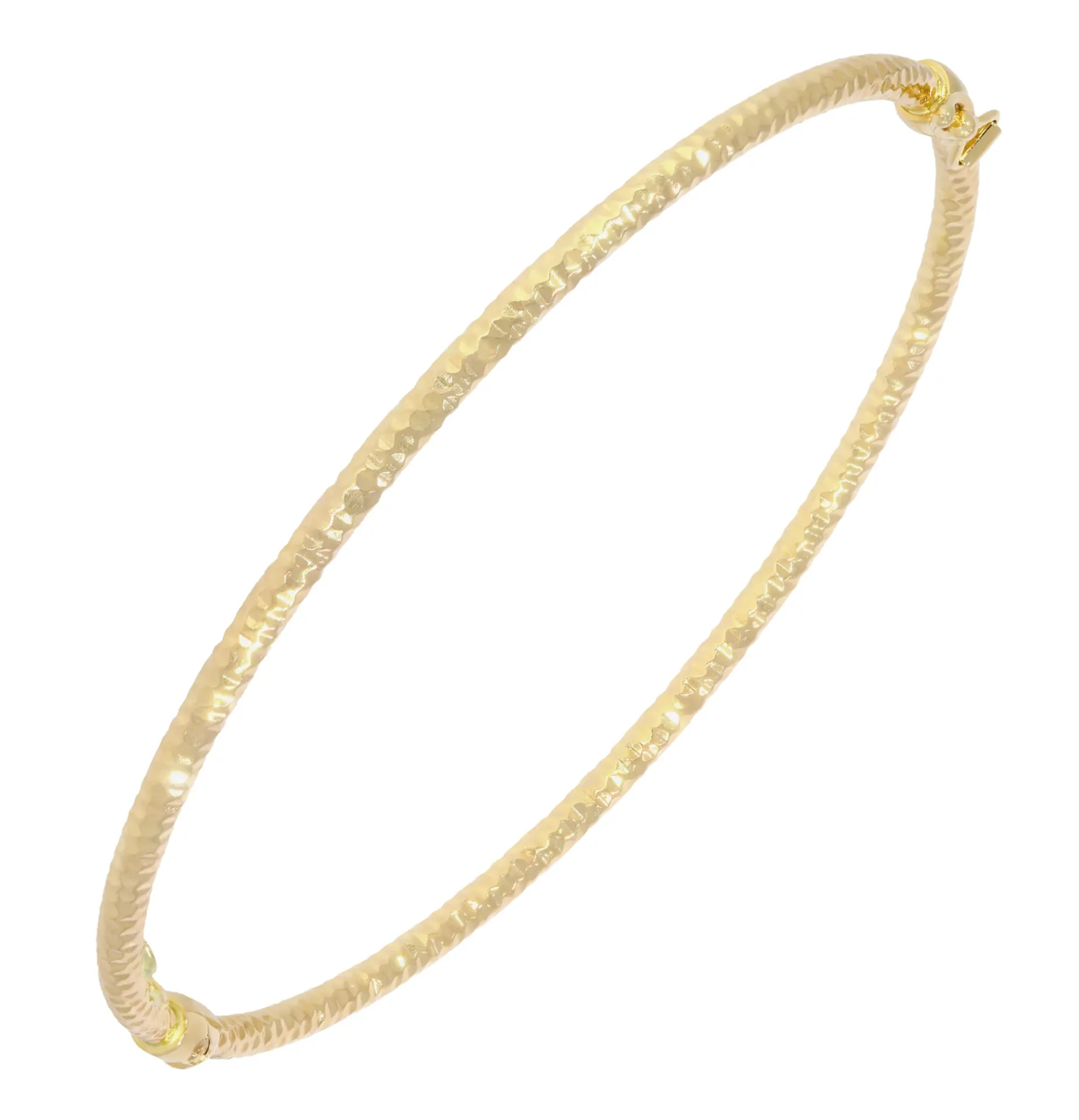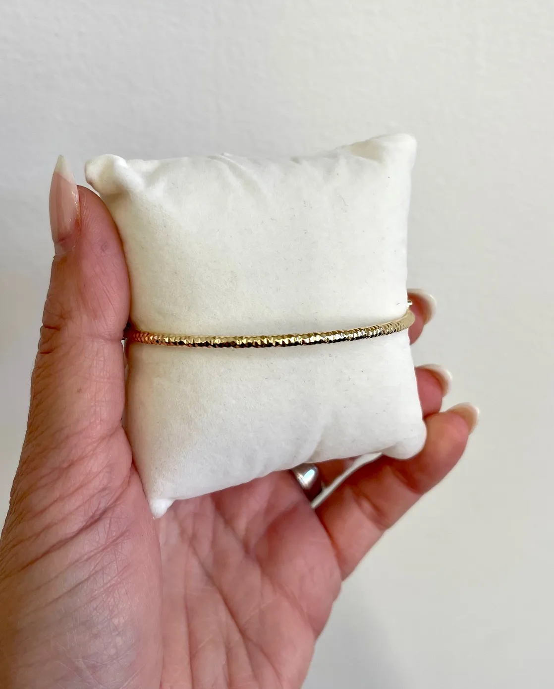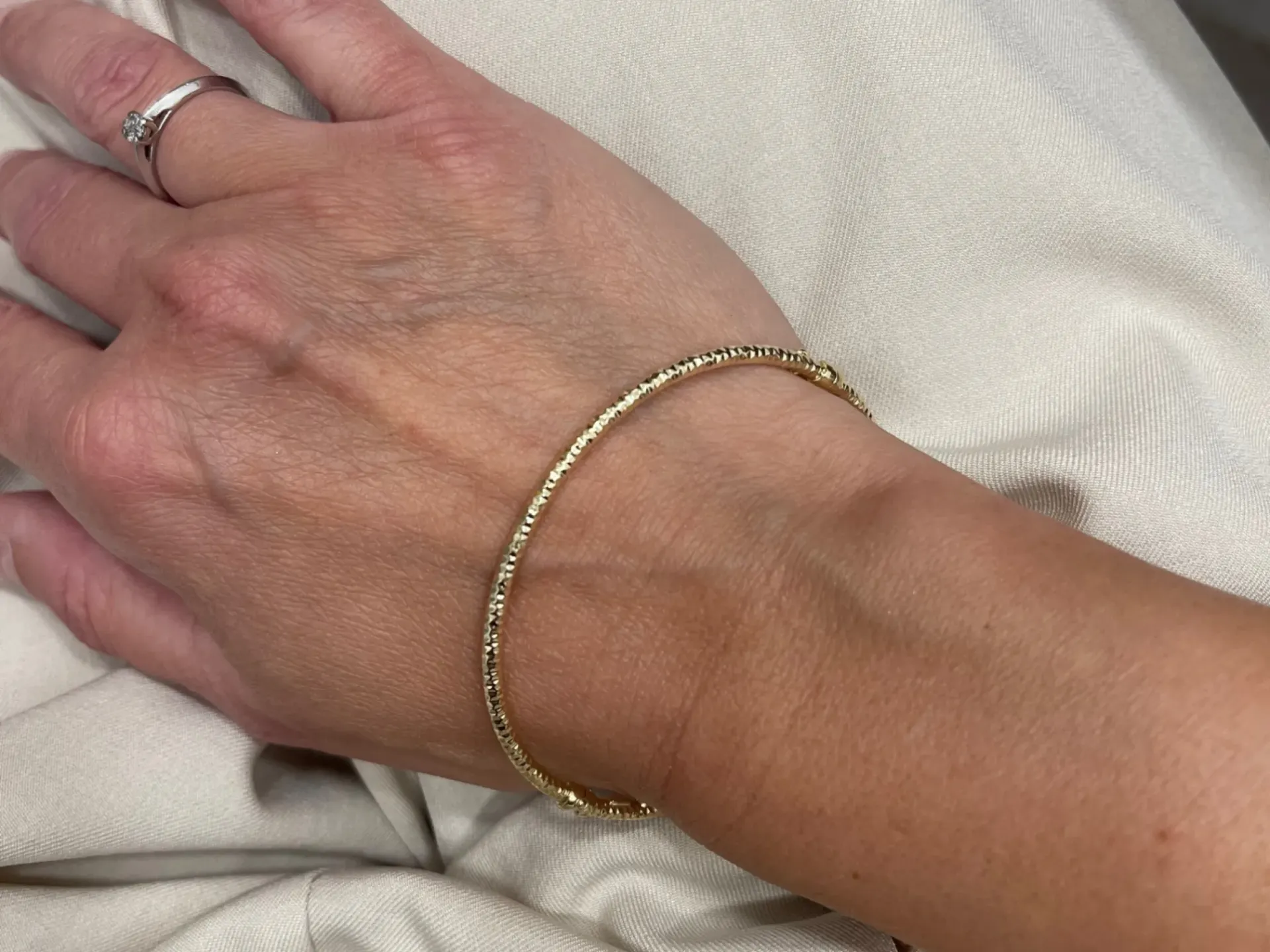 Trblietavý zlatý náramok s gravírovaným vzorom.