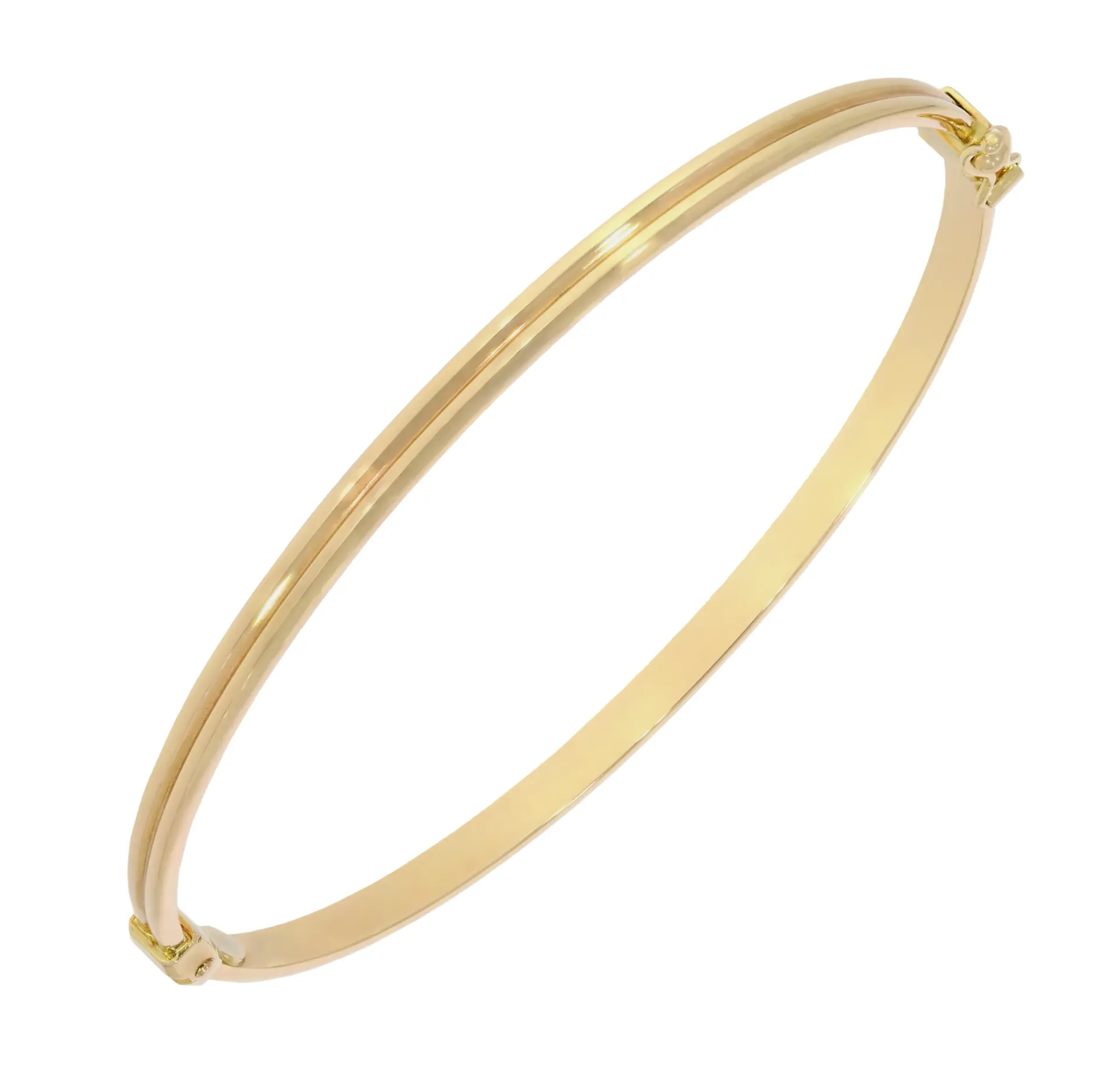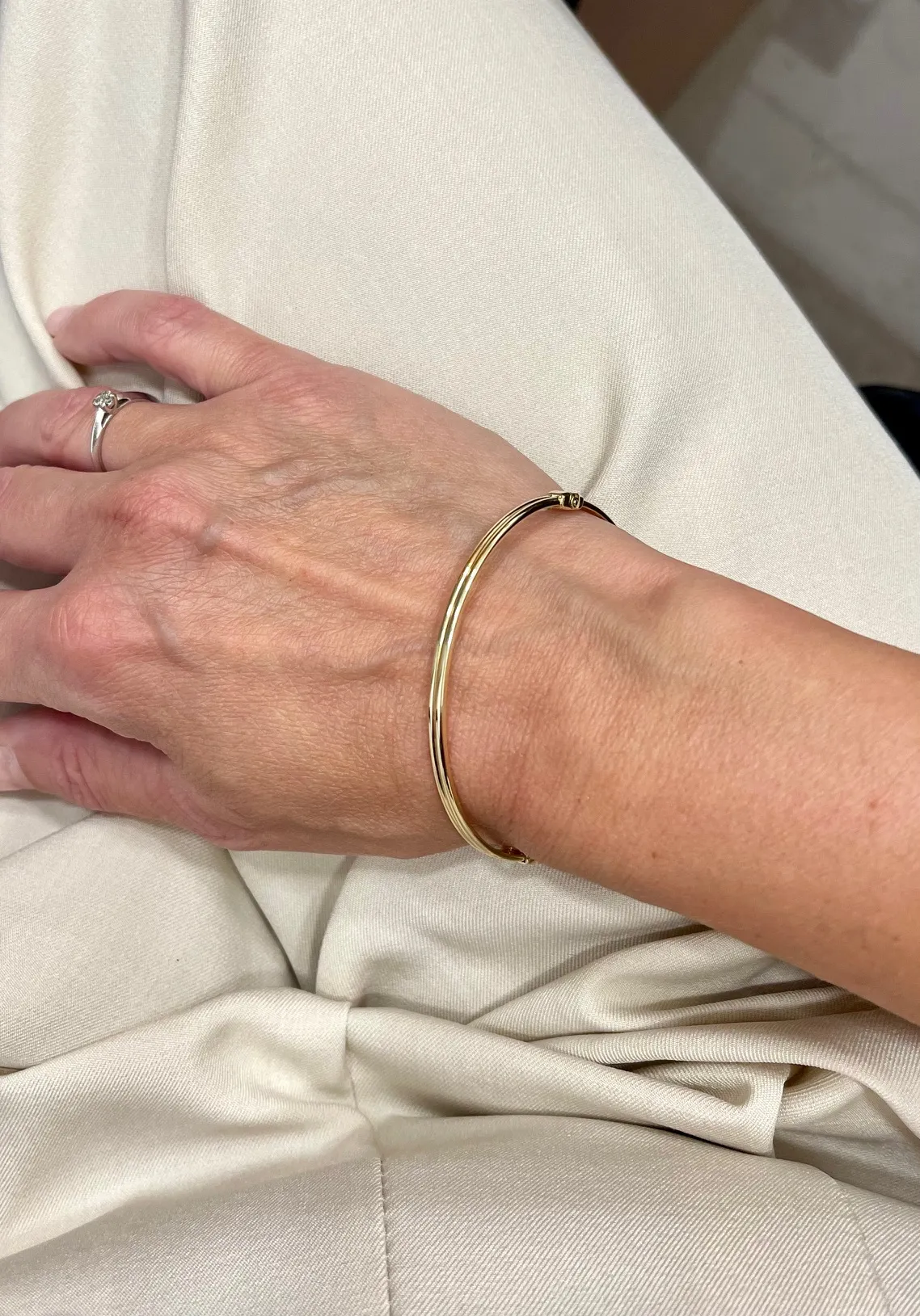 Krásny zlatý náramok s moderným dizajnom je vytvorený akoby spojením dvoch hladký, lesklých náramkov vedľa seba. Šperk je vyrobený zo žltého 14k zlata a má bezpečné zapínanie s poistkou.