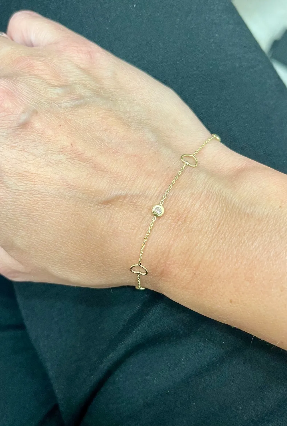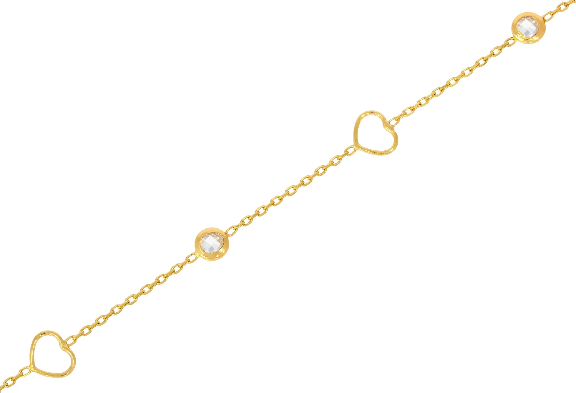 Krásny náramok vyrobený zo žltého 14k zlata zdobia tri zlaté srdiečka s rozmermi 6x6mm a tri biele zirkóny s priemerom 4mm. Jeho dĺžka je regulovateľná v rozmedzí 2cm. Zapínanie má tvar pérového krúžku. Spolu so Zlatou retiazkou 1254 tvorí krásnu súpravu.