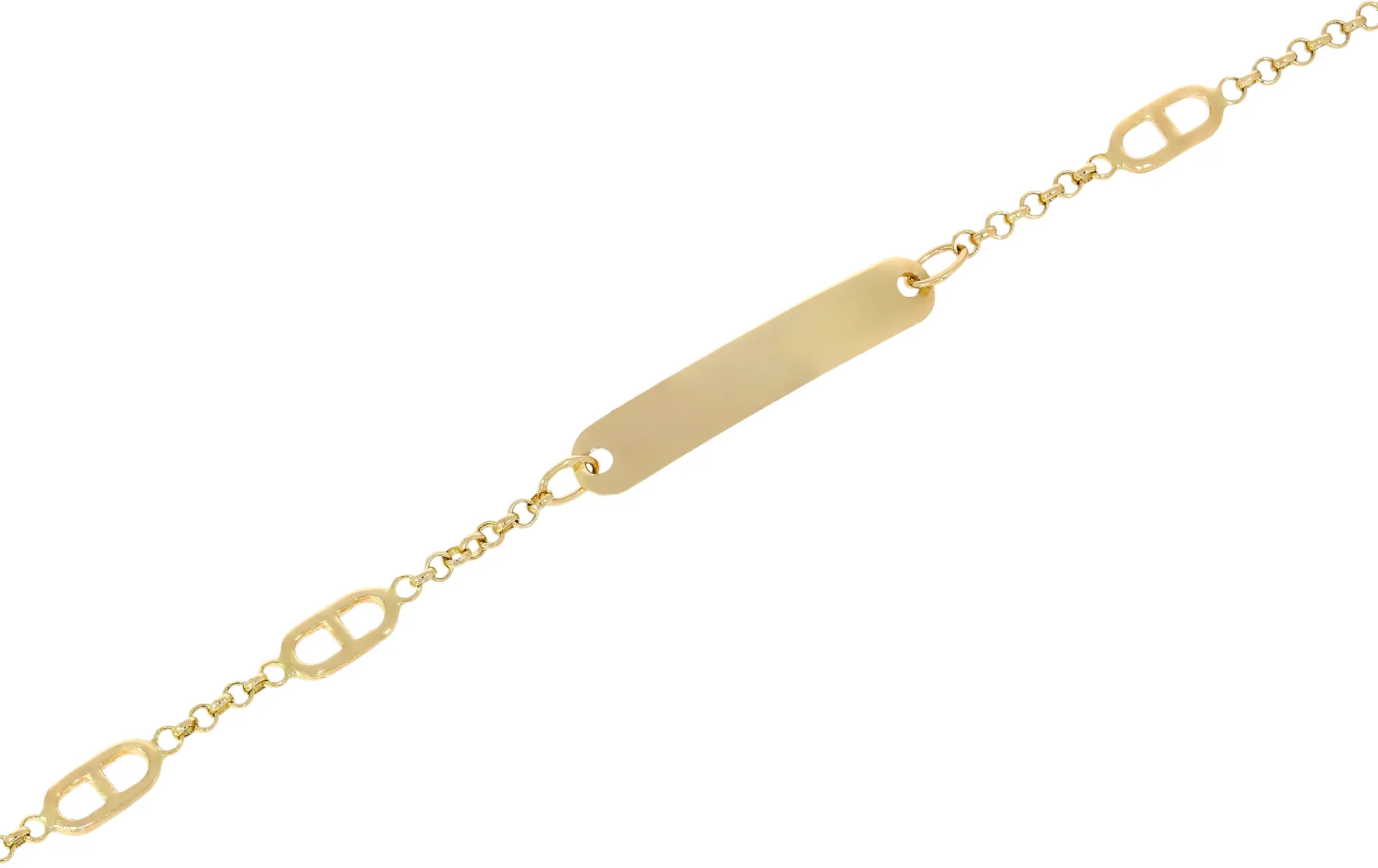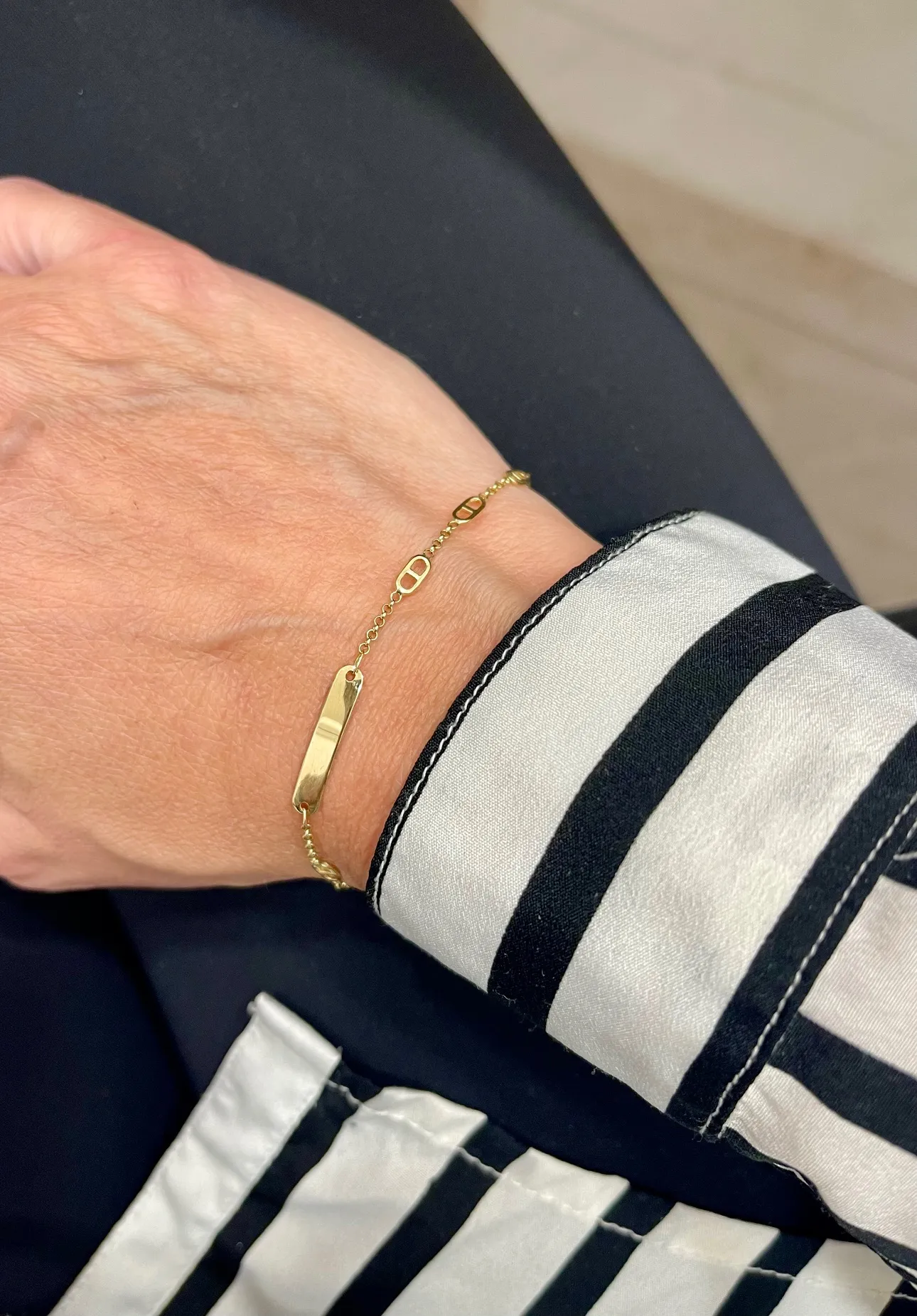 Pekný zlatý náramok zdobený hladkou, lesklou platničkou s rozmermi 20x4mm, ktorá je vhodná aj na gravírovanie. Dĺžka náramku je nastaviteľná na 14cm alebo 16cm. Použité zapínanie má tvar karabínky.
