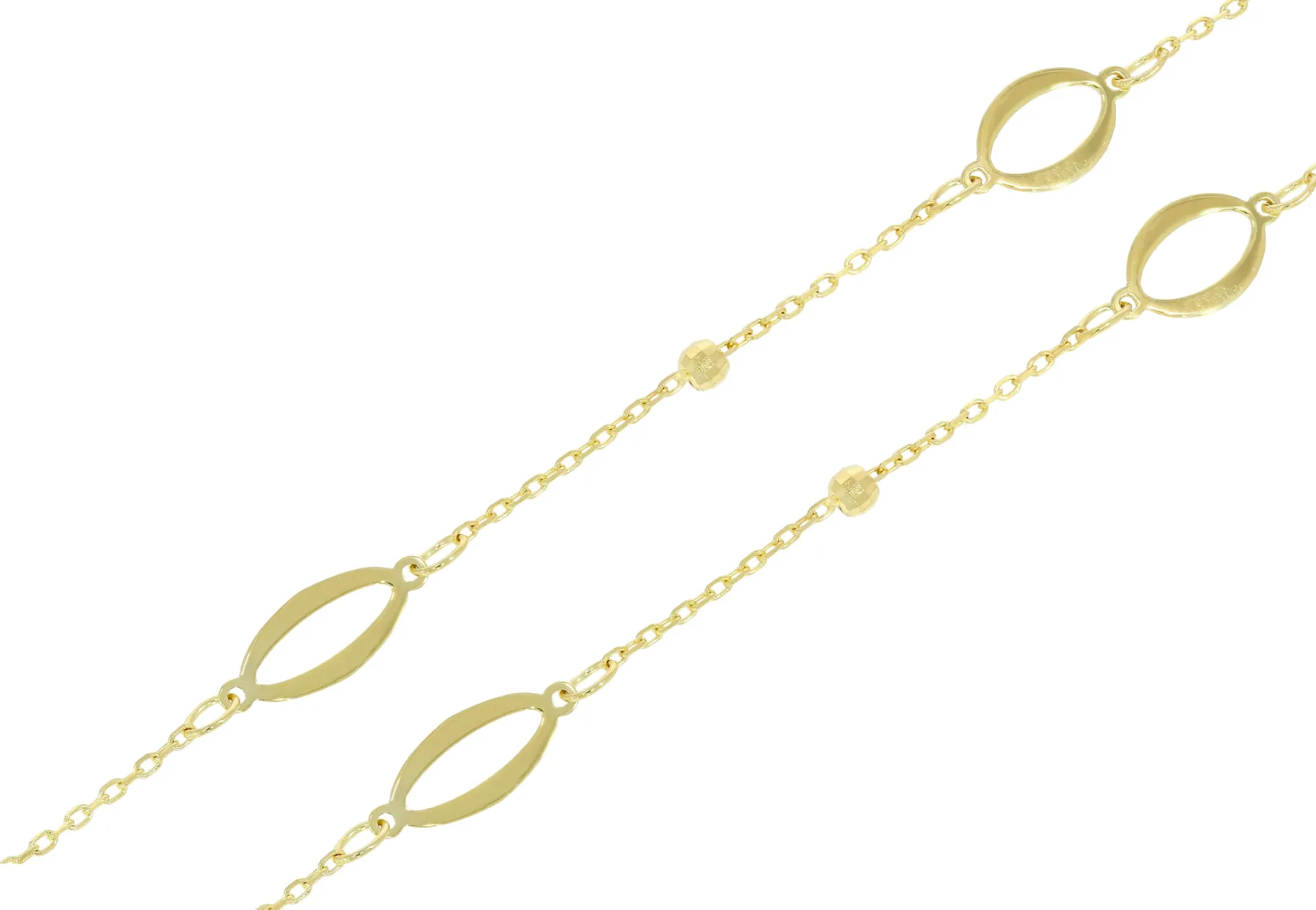 Pekná zlatá retiazka vyrobená zo žltého 14 karátového zlata. zdobia ju hladké, lesklé prívesky a gravírované lesklé guľky. Dĺžka retiazky je regulovateľná v rozmedzí troch centimetrov. Použité zapínanie má tvar pérového krúžku.