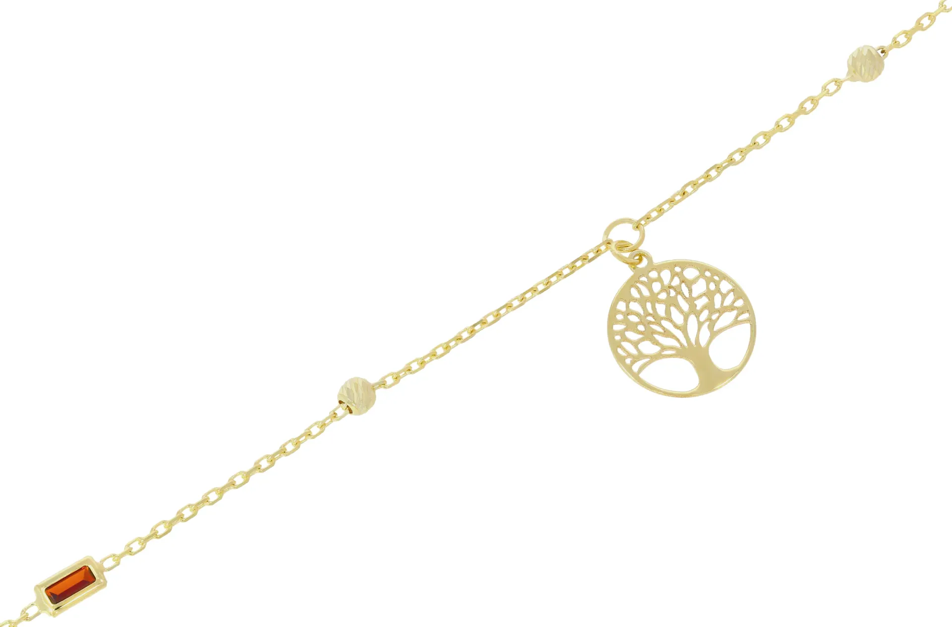 Krásny náramok vyrobený zo žltého 14k zlata zdobený obľúbeným motívom stromu života s priemerom 10mm. Náramok zdobí tiež zelený a červený podlhovastý kamienok a gravírované zlaté guľky. Dĺžka náramku je regulovateľná v rozmedzí 3cm. Zapínanie šperku má tvar pérového krúžku. Spolu so Zlatou retiazkou 1150 tvoria krásnu súpravu.