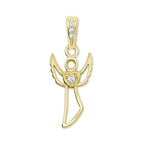 Krásny prívesok zo žltého zlata vyrobený v tvare anjela. Šperk zdobia biele zirkóny.