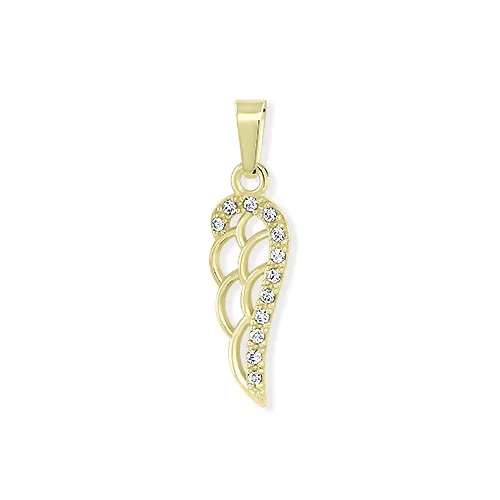 Krásny prívesok vyrobený v tvare anjela zo žltého 14 karátového zlata je zdobený bielymi zirkónmi.