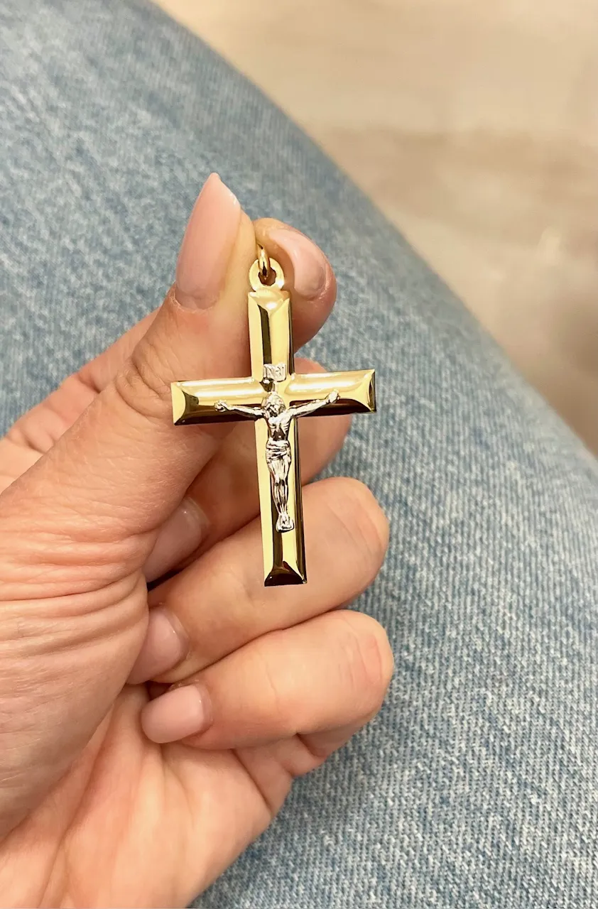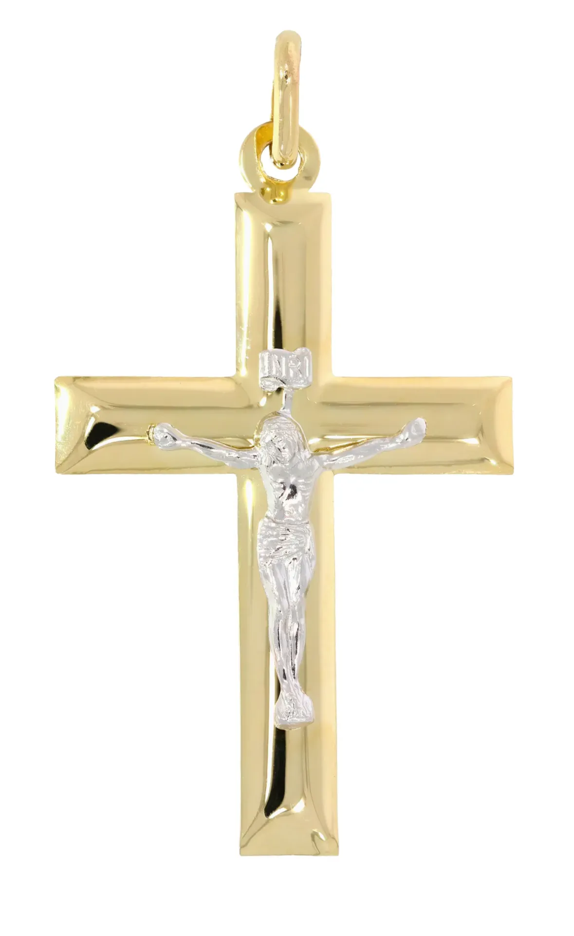 Krásny, výrazný kríž vyrobený zo žltého zlata, na ktorom je znázornené umučenie Krista z bieleho zlata. Prívesok má lesklú povrchovú úpravu a vďaka svojej univerzalite je vhodný pre dámy aj pánov.