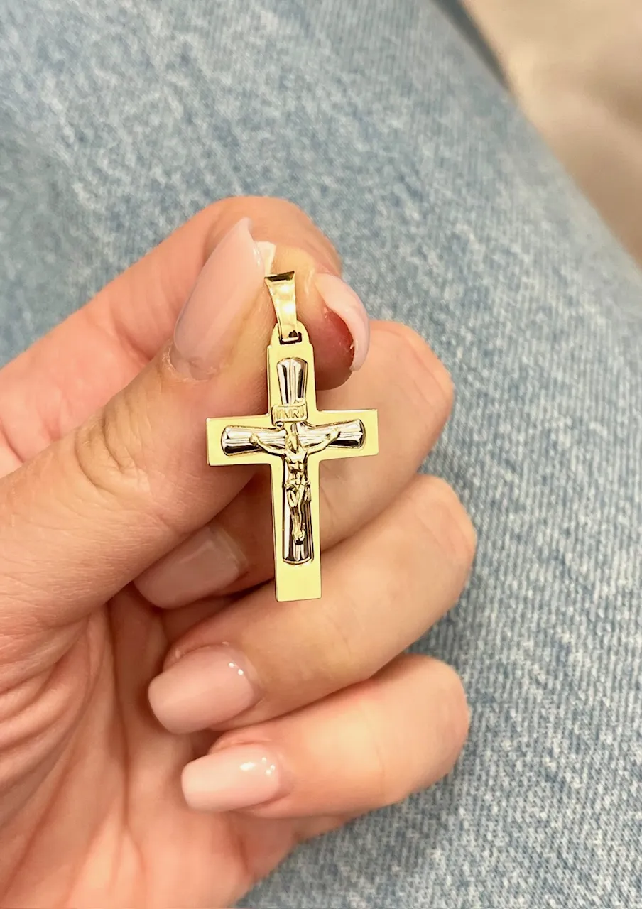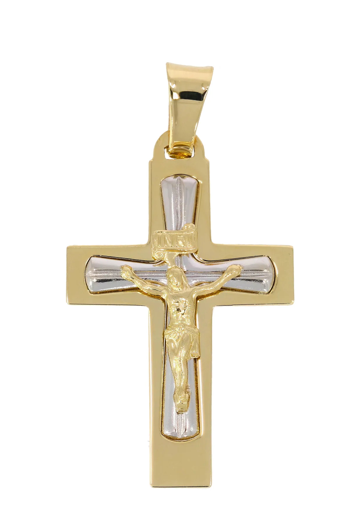 Moderný prívesok je vyrobený akoby spojením dvoch krížov a to hladkého, lesklého zo žltého zlata a gravírovaného bieleho, na ktorom je znázornené umučenie Krista. Prívesok je univerzálny, takže je vhodný pre dámy aj pánov.