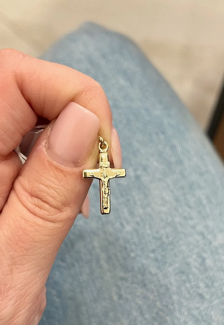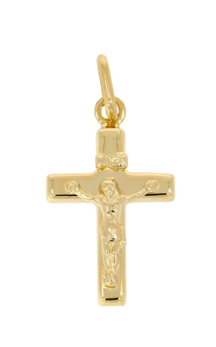 Pekný, minimalistický prívesok zo žltého zlata vyrobený v tvare kríža, na ktorom je znázornené umučenie Krista.