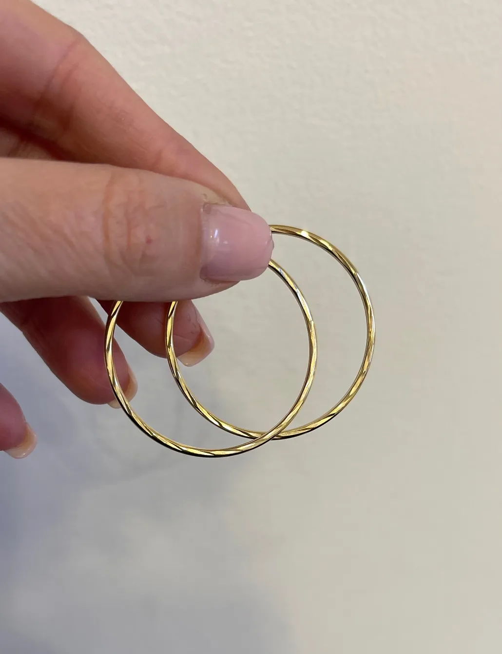 Pekné náušnice kruhového tvaru vyrobené zo žltého 14 karátového zlata zdobené moderným gravírovaným vzorom.