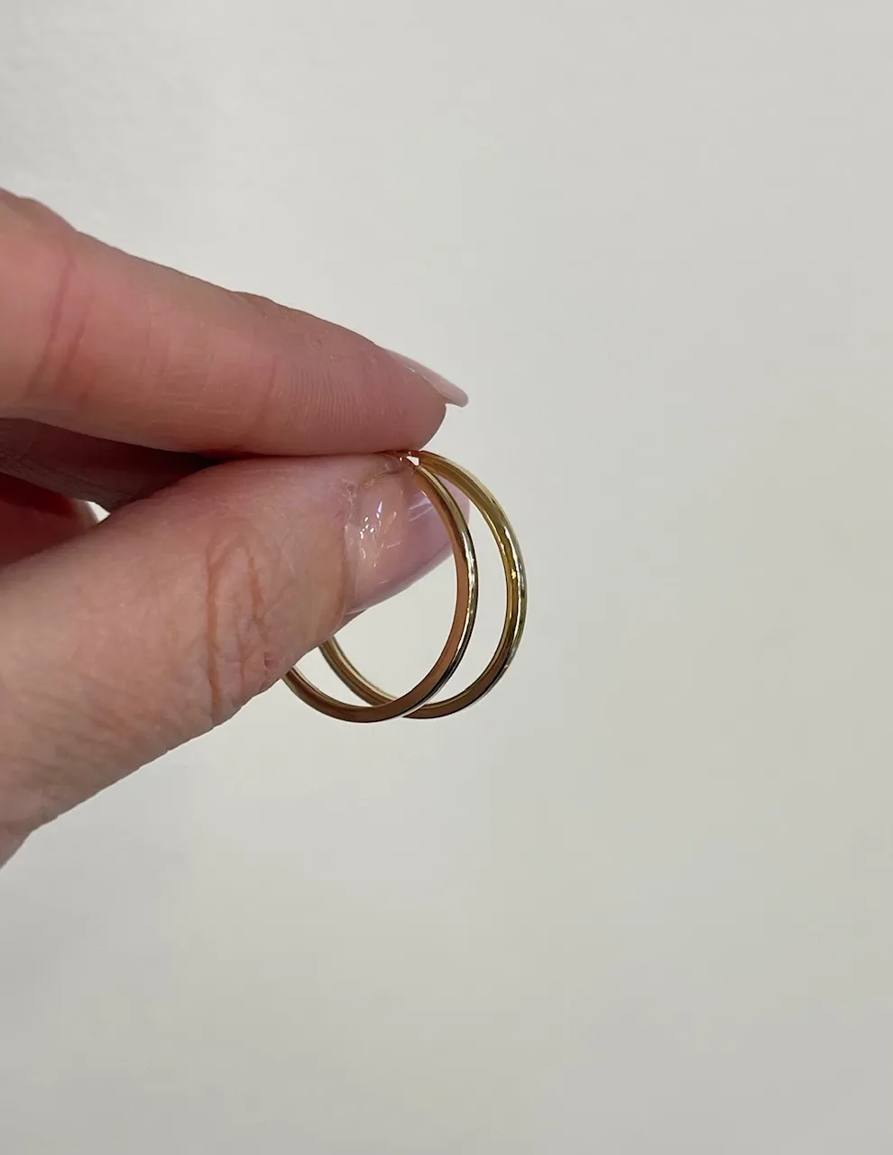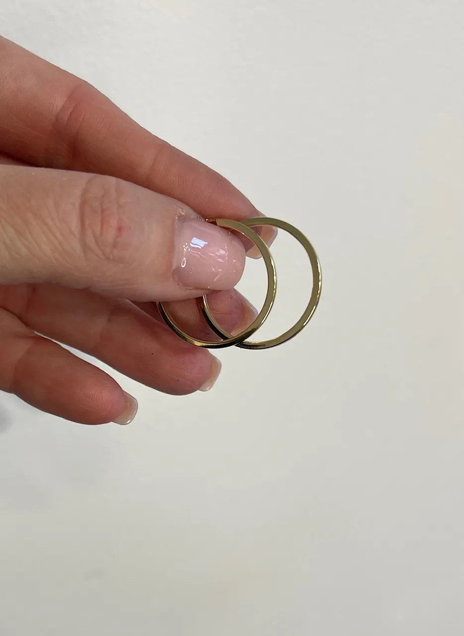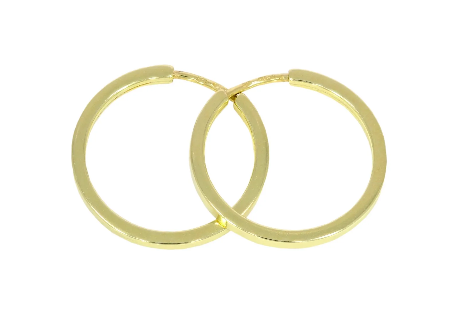 Jednoduché zlaté kruhové náušnice s hladkou, lesklou povrchovou úpravou a hranatým prierezom.