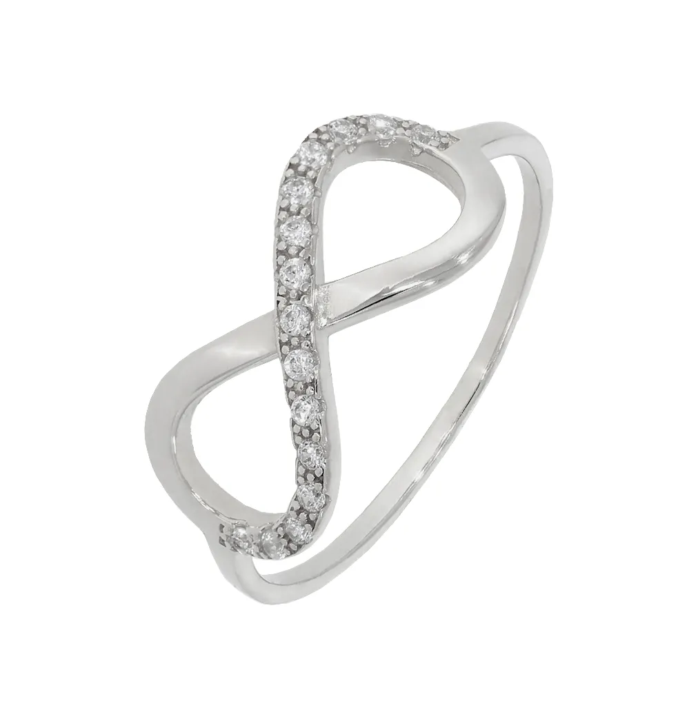 Prsteň z bieleho zlata s motívom nekonečna zdobia z jednej strany drobné biele zirkóny.