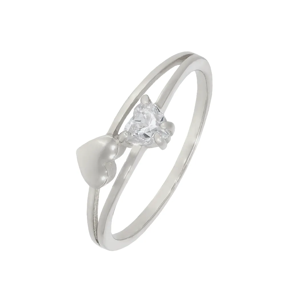 Krásny prsteň vyrobený z bieleho 14 karátového zlata zdobia dve srdiečka - jedno hladké, zlaté a druhé zirkónové. Tento krásny romantický šperk je ideálny aj ako darček.