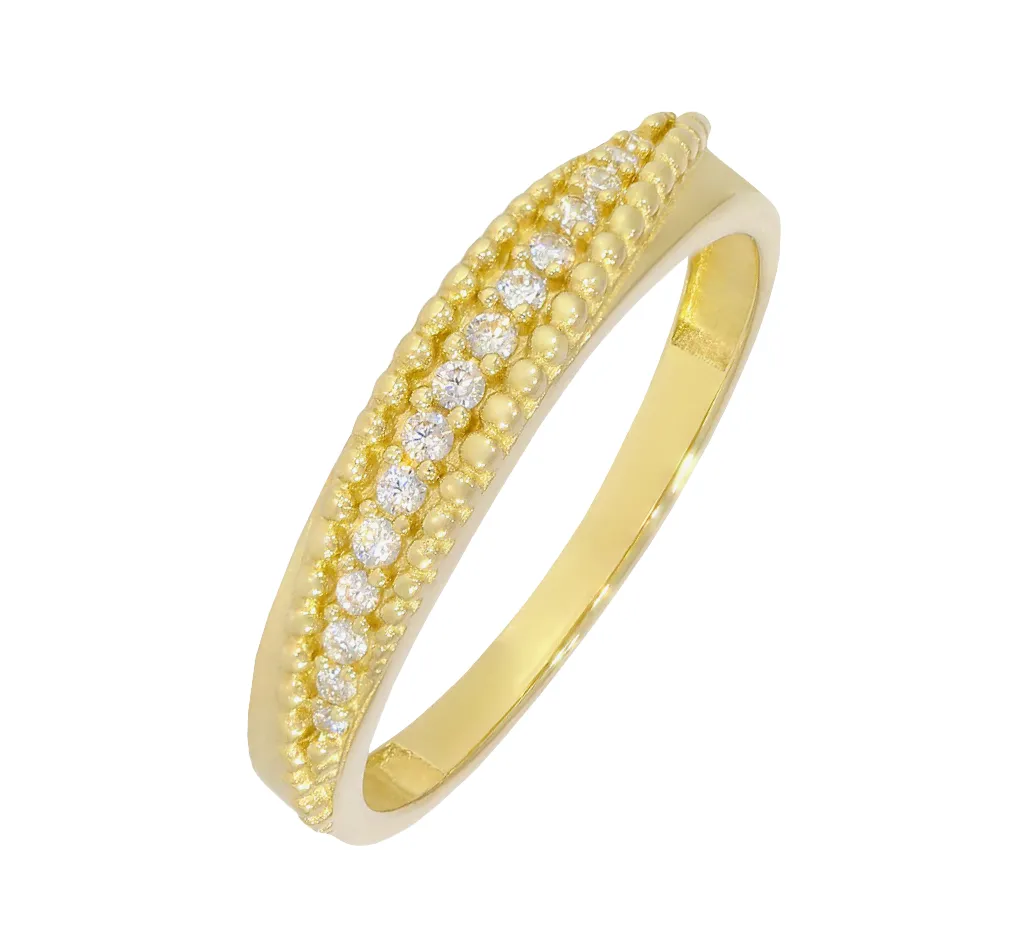 Krásny dámsky prsteň vyrobený zo žltého 14 karátového zlata. Šperk zdobí línia bielych zirkónov a jemný vzor.
