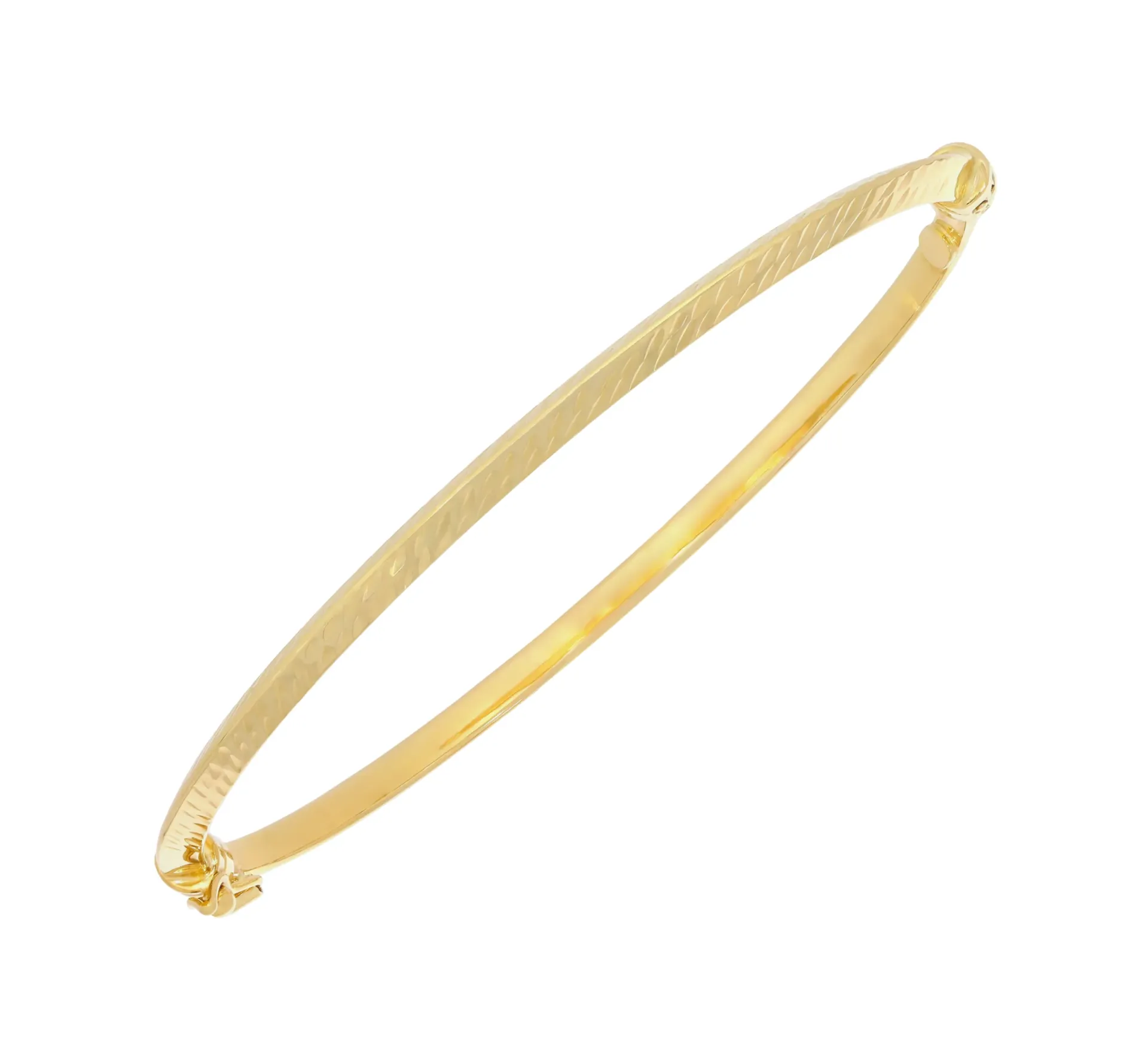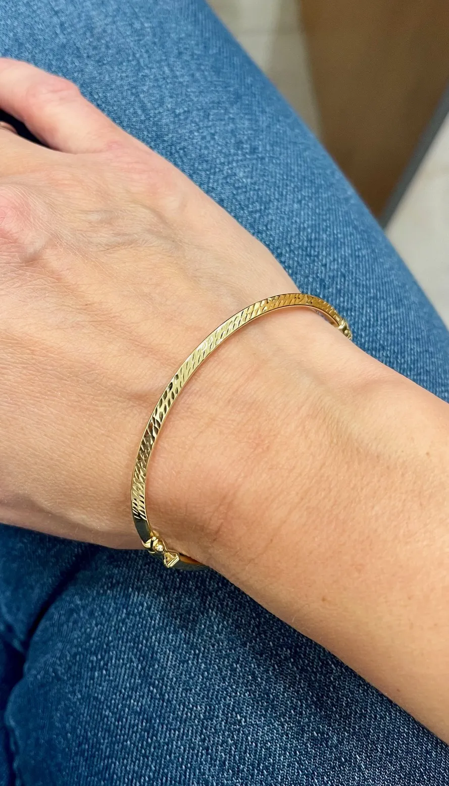 Krásny obručový náramok vyrobený zo žltého 14k zlata zdobený gravírovaným vzorom. Náramok má bezpečný uzáver s poistkou, a jeho vnútorný obvod 17cm.