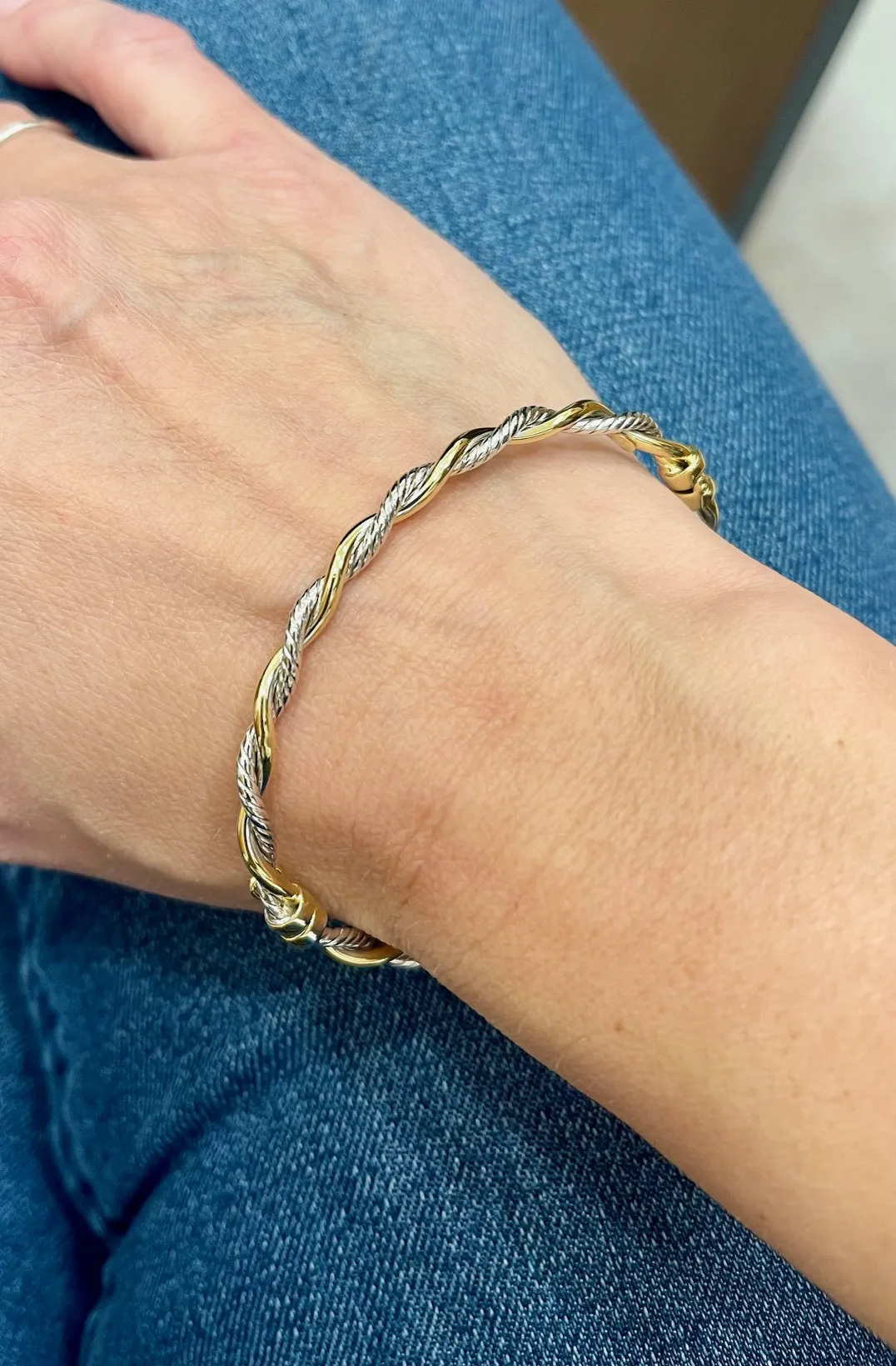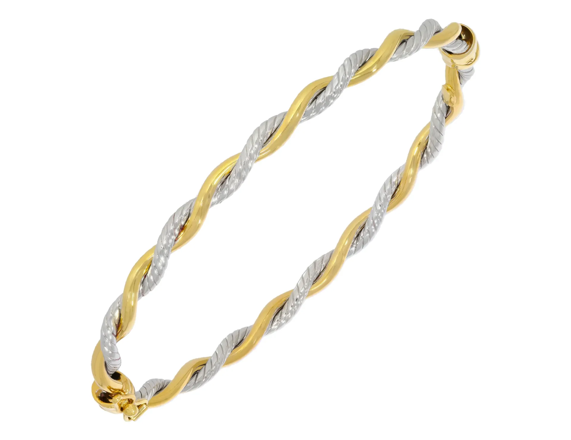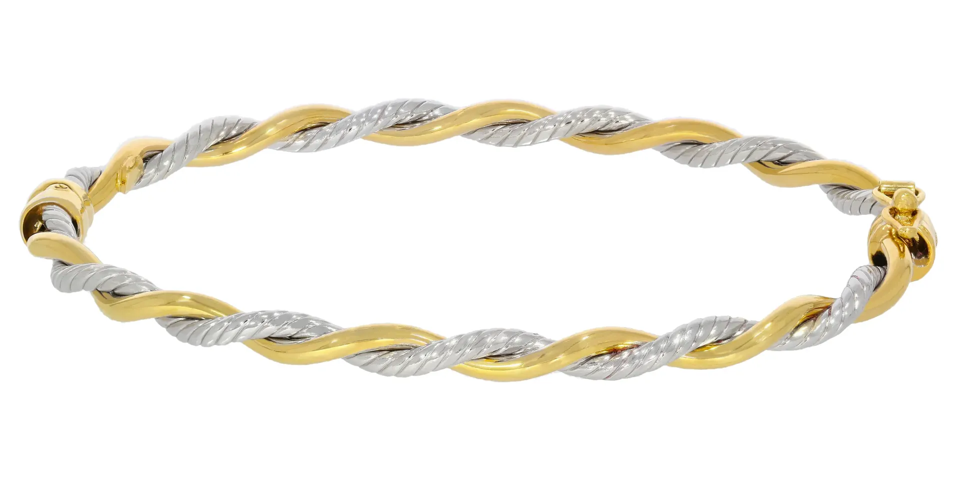 Skutočne rozprávkovo krásny dámsky zlatý náramok obručového typu vyrobený v elegantnom točenom motíve. Náramok v sebe spája hladkú lesklú líniu žltého zlata a gravírovanú líniu bieleho zlata. Šperk má bezpečný uzáver s poistkou a vnútorný priemer cca 17cm.