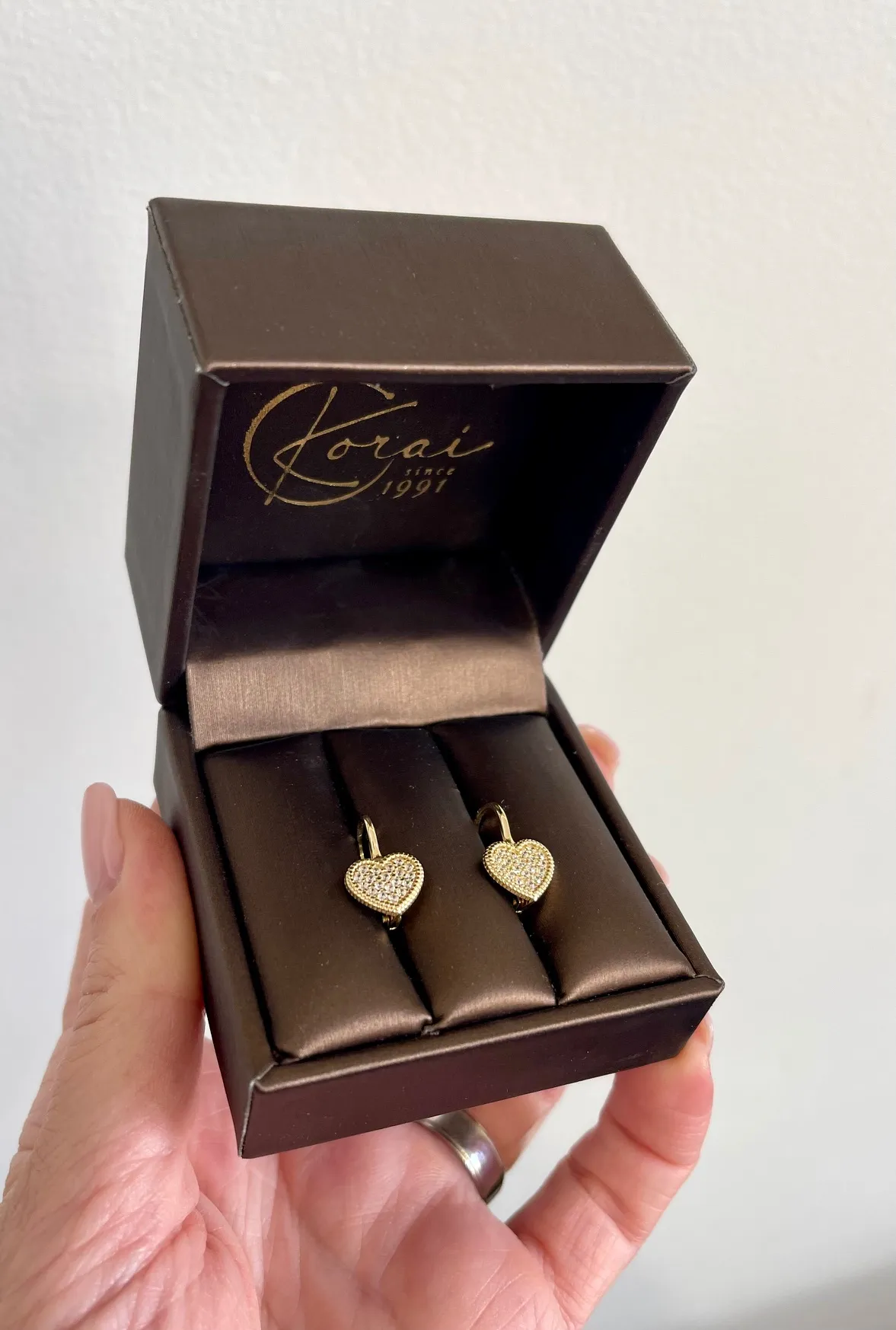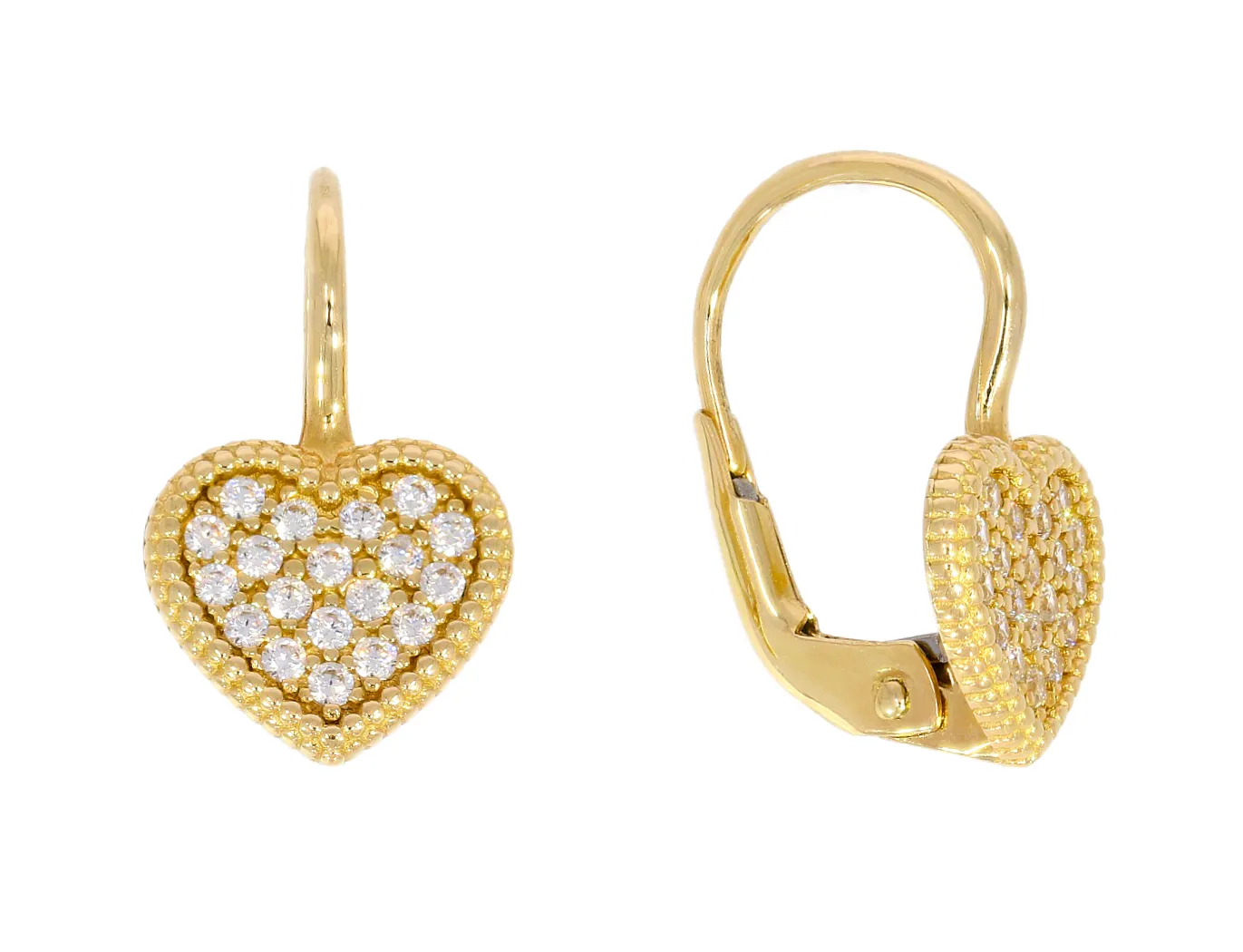 Krásne zlaté náušnice vyrobené v tvare srdca, ktoré sú zdobené množstvom bielych zirkónov. Náušnice majú krásny vzorovaný lem a patentové zapínanie.