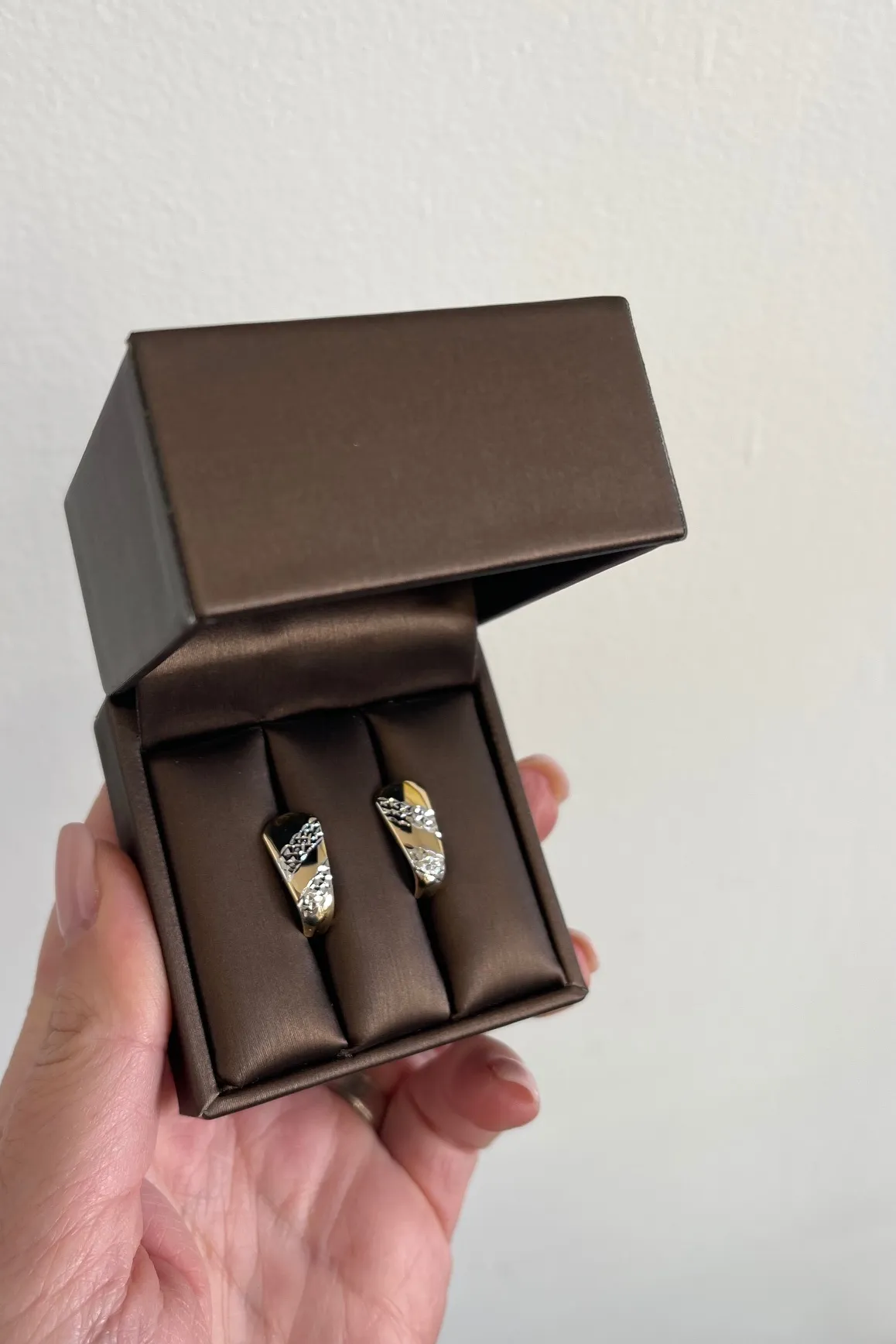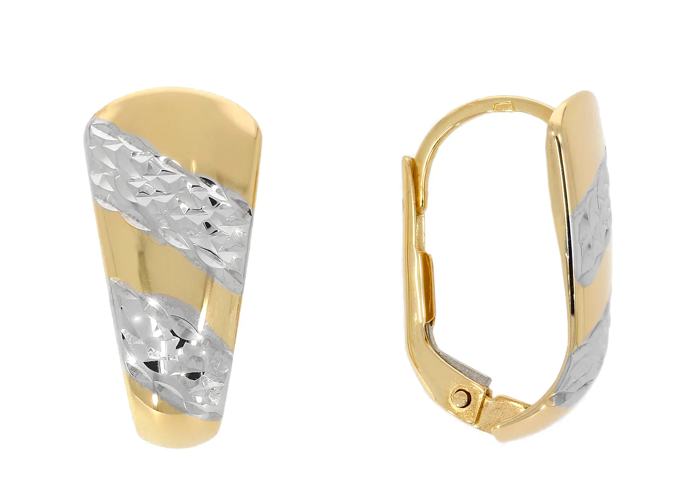Pekné zlaté náušnice vyrobené zo žltého 14 karátového zlata zdobené bielym tónovaním zlata a jemným gravírovaným vzorom. Náušnice majú lesklú povrchovú úpravu a sú vhodné aj ako darček.