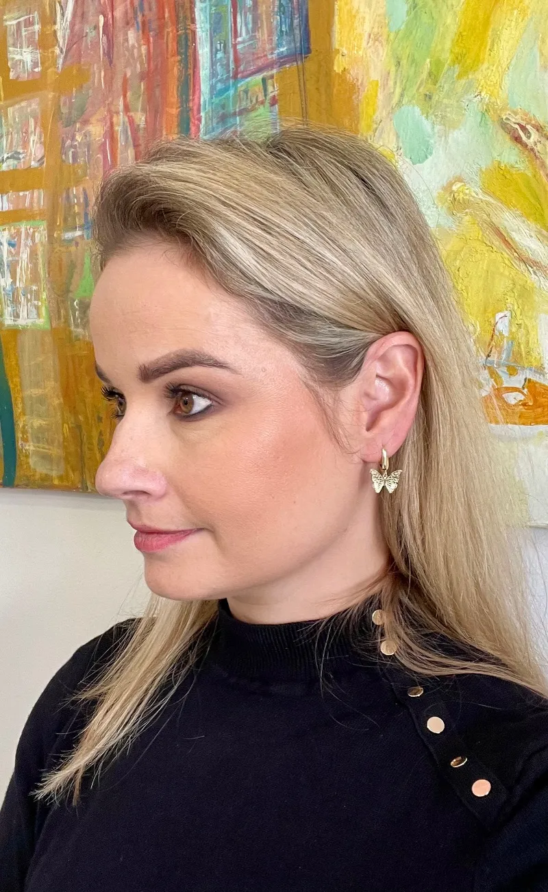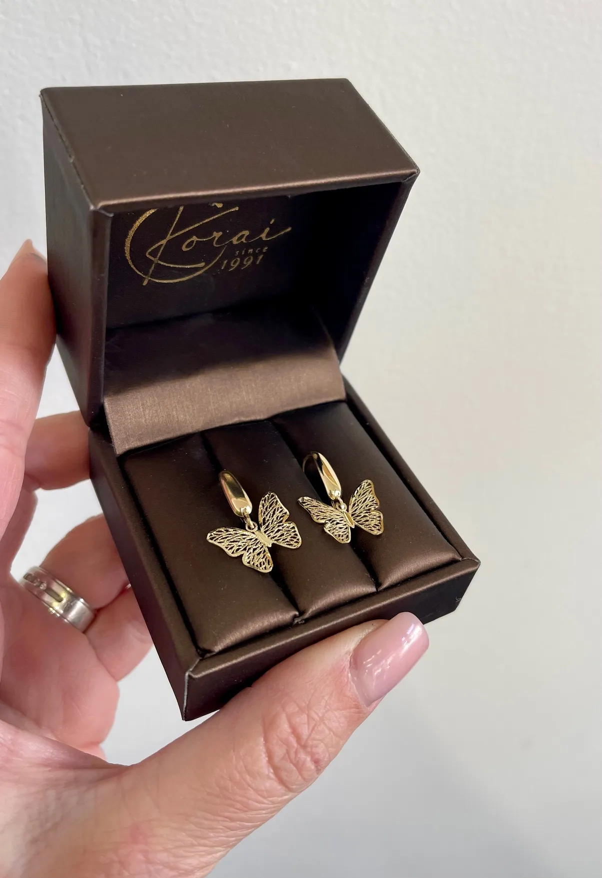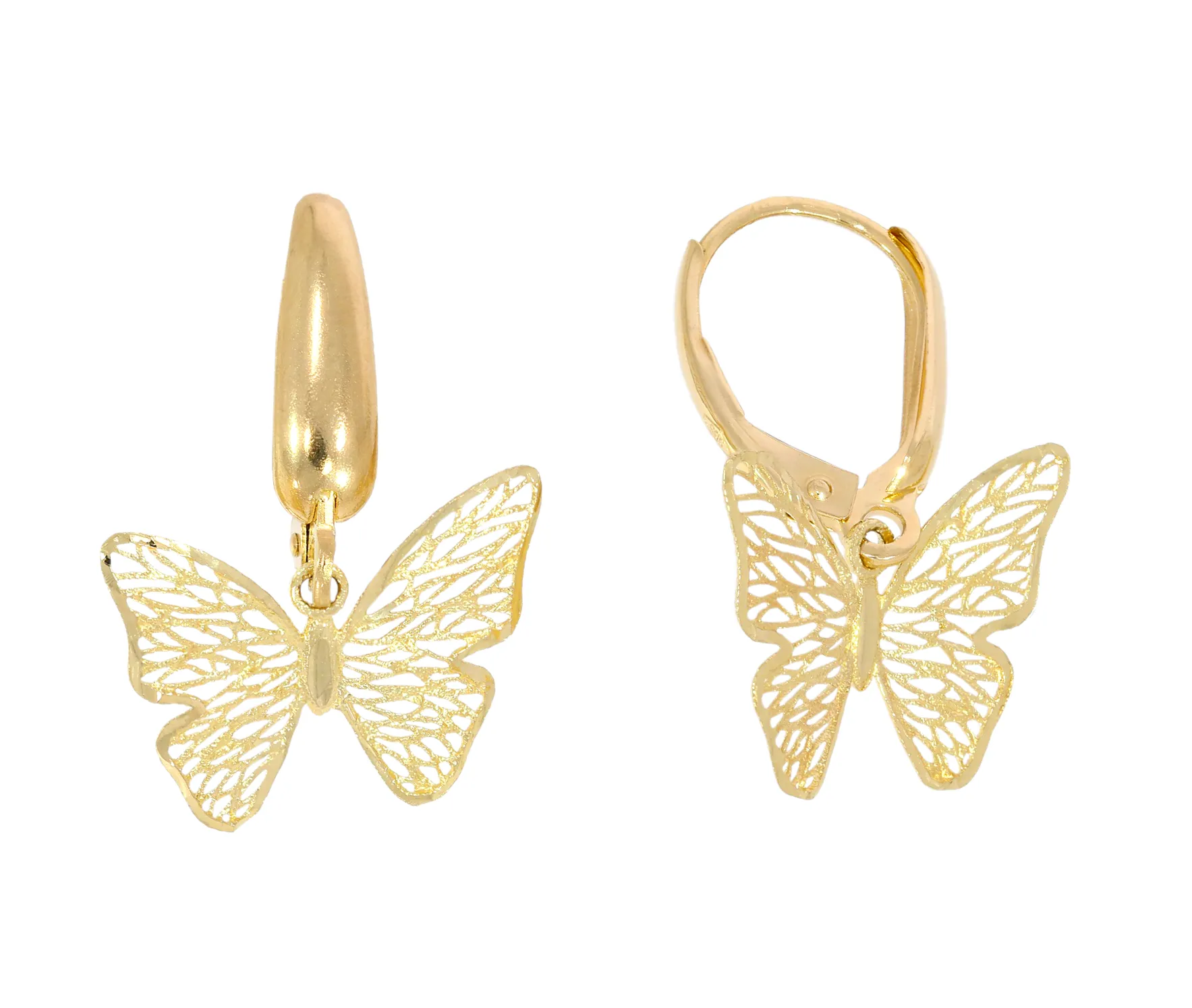 Krásne zlaté visiace náušnice vyrobené zo žltého 14 karátového zlata v tvare motýľov. Náušnice majú krásne prepracované detaily, patentové zapínanie a sú ideálne aj ako darček.