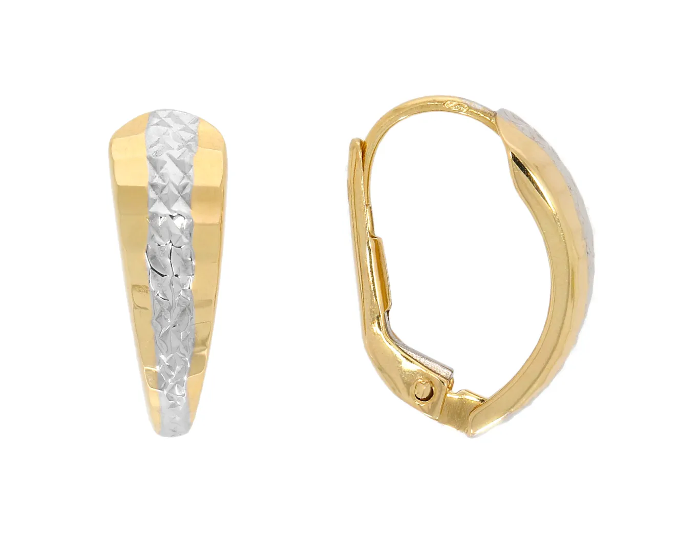 Patentové zlaté náušnice zdobené bielym tónovaním zlata a gravírovaným vzorom.