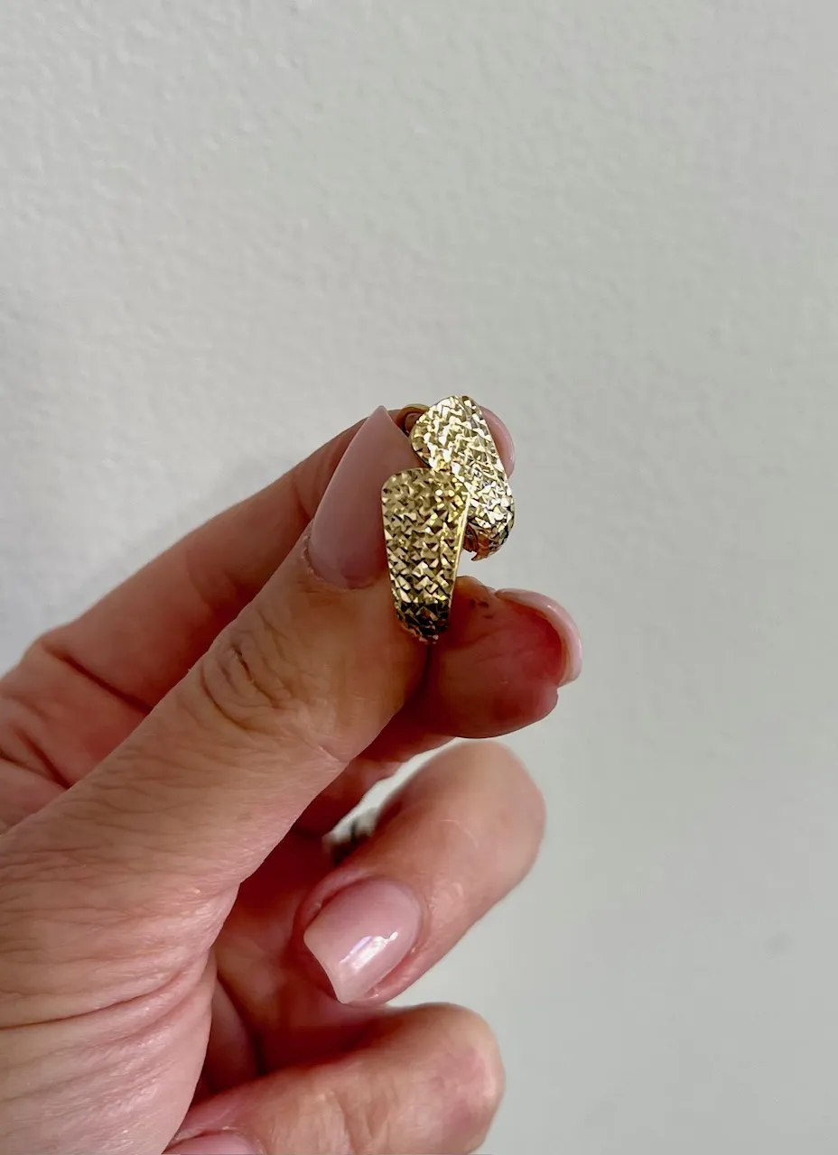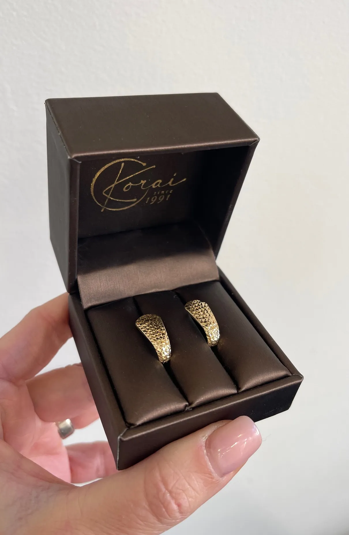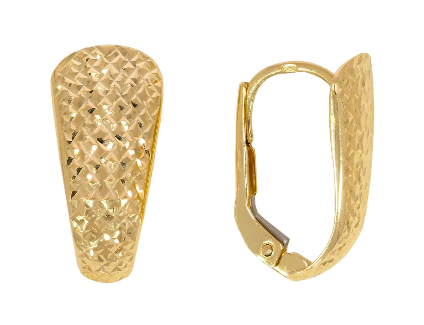 Zlaté náušnice zdobené gravírovaným vzorom vyrobené zo žltého 14 karátového zlata.