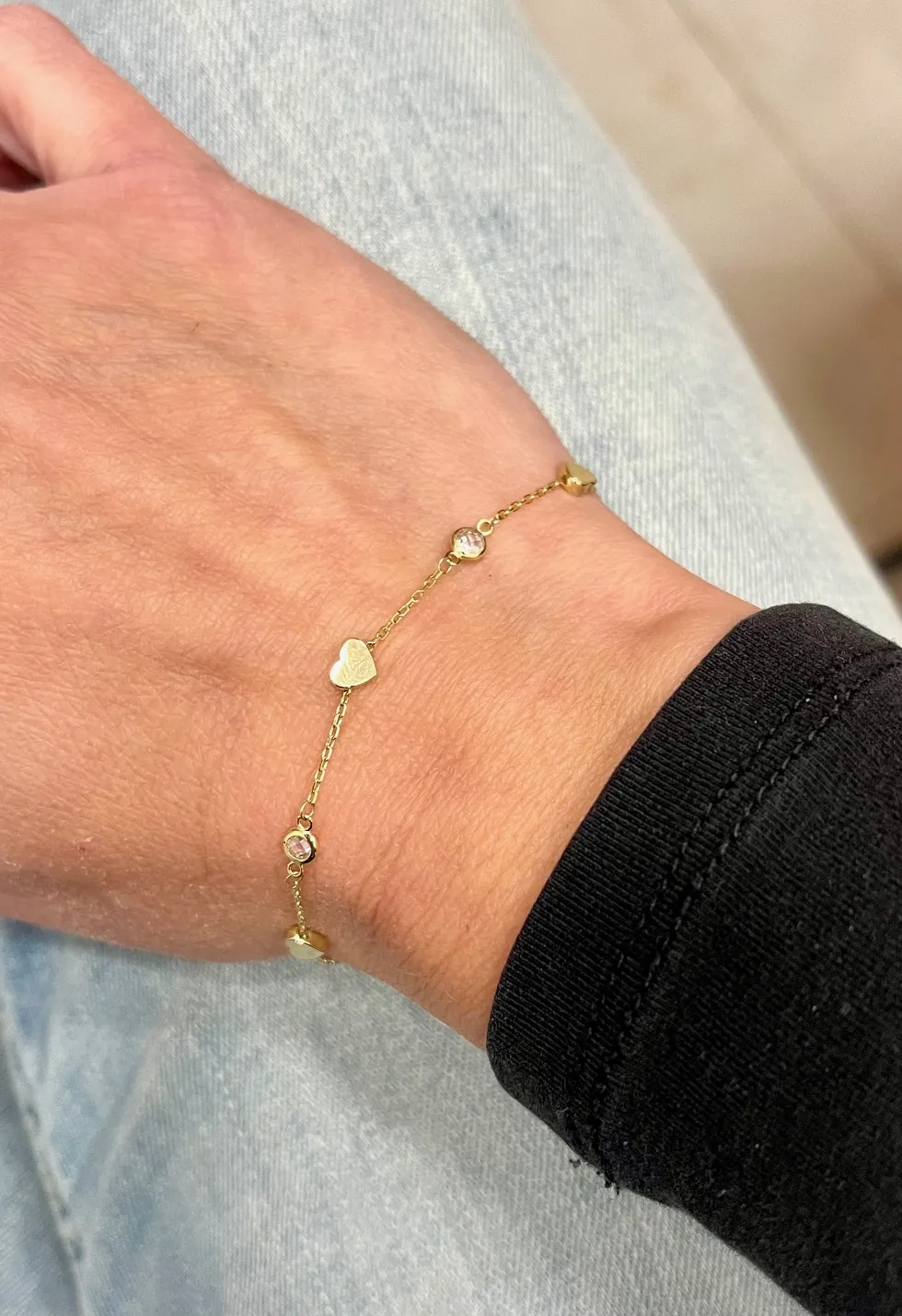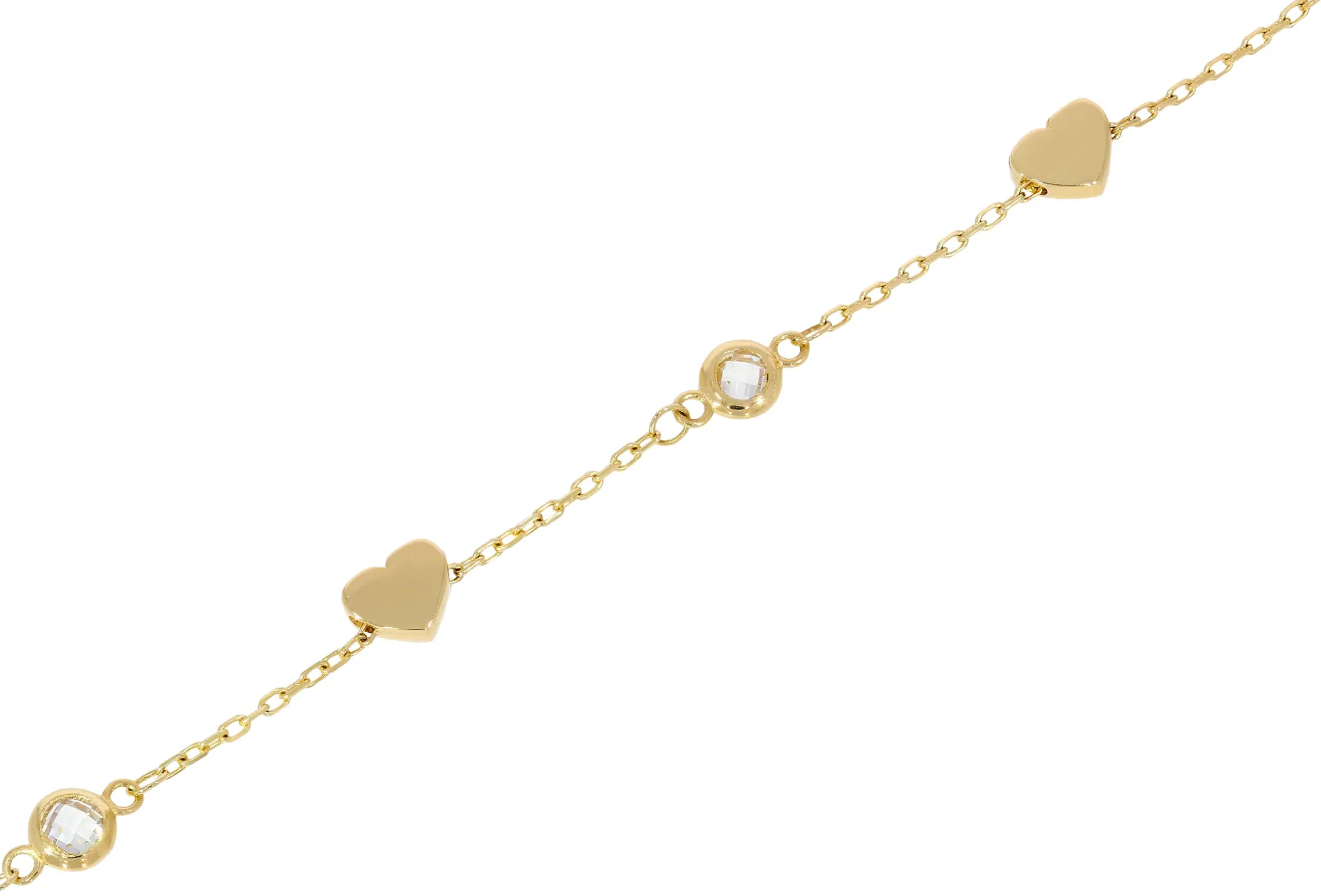 Zlatý náramok zdobený tromi hladkými, lesklými srdiečkami a bielymi zirkónmi. Náramok má dĺžku regulovateľnú v rozmedzí 2cm a zapínanie v tvare karabínky.