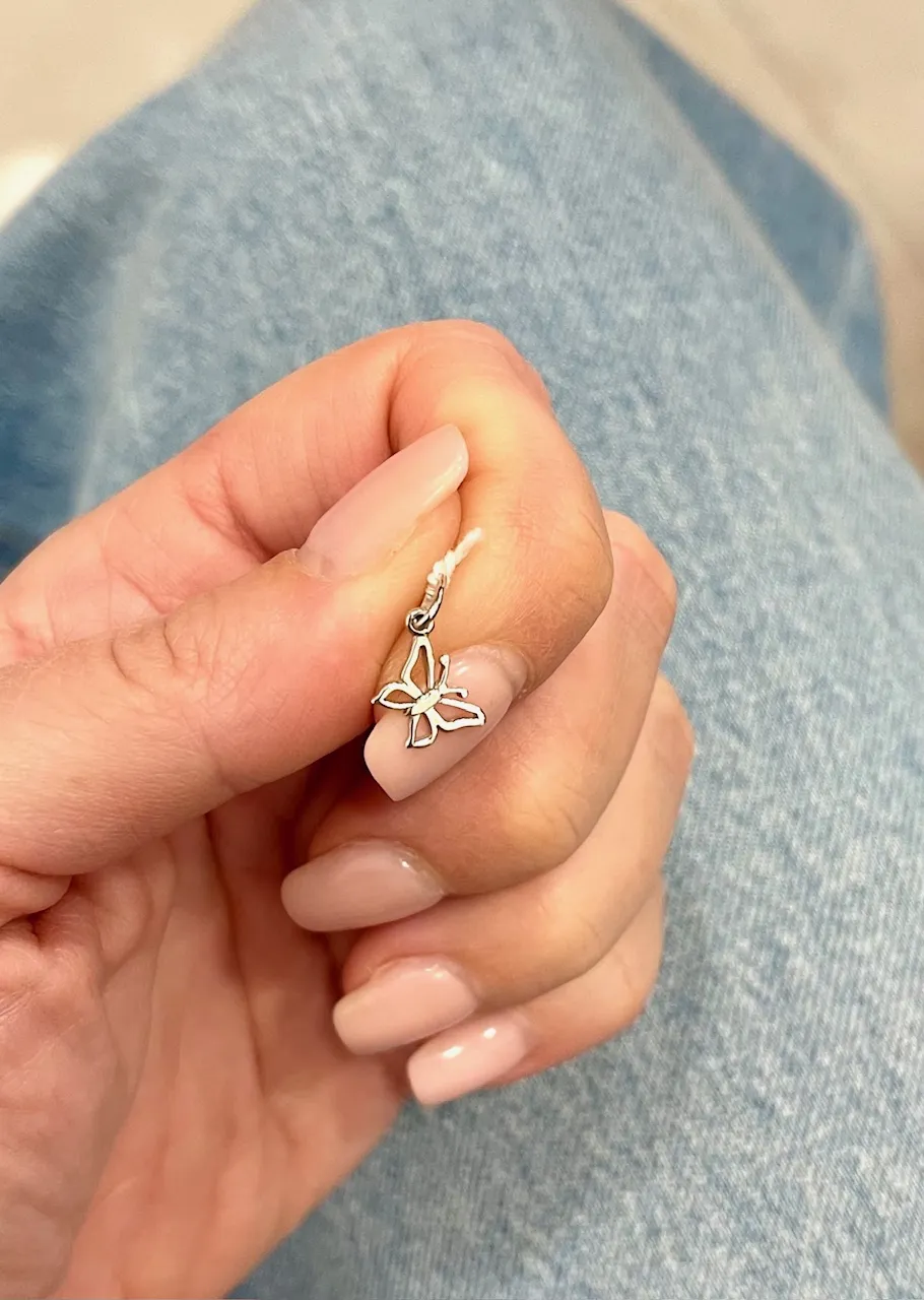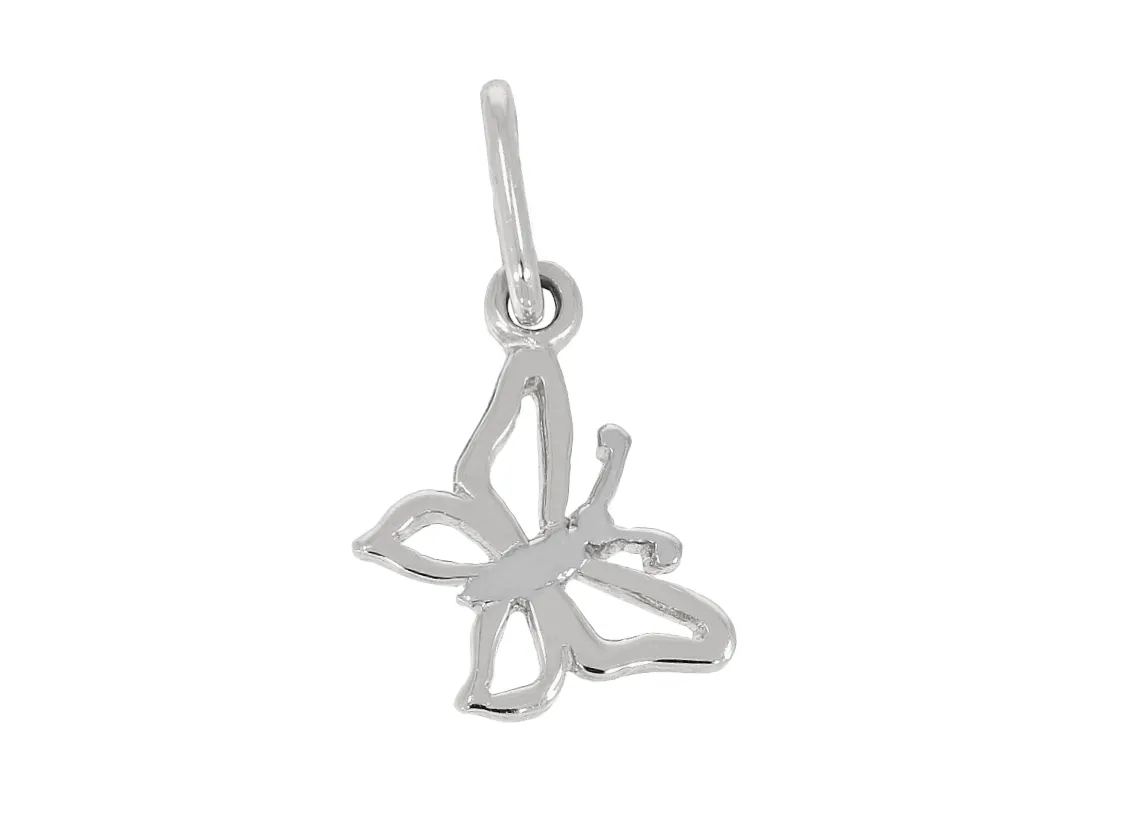 Nežný prívesok vyrobený z bieleho 14 karátového zlata vyrobený v tvare motýľa s lesklou povrchovou úpravou.