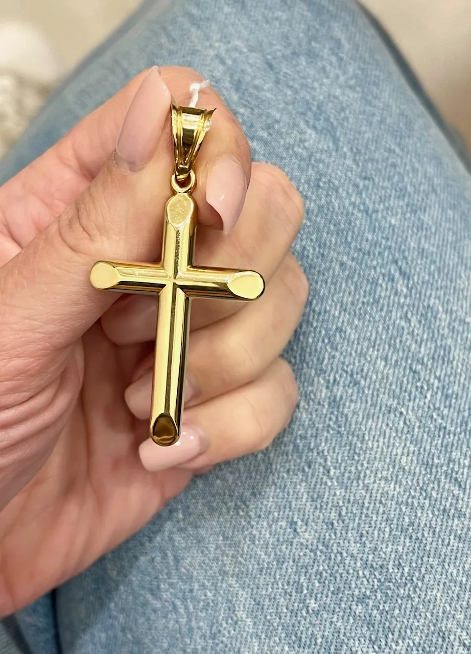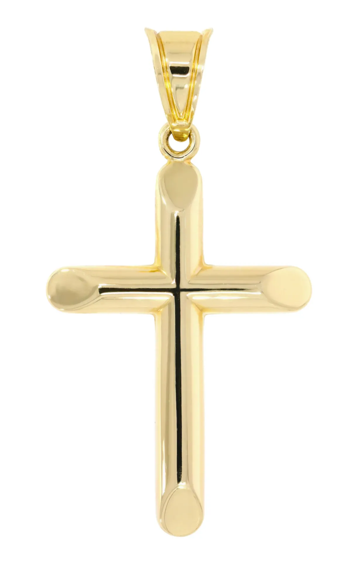 Hladký, lesklý kríž vyrobený zo žltého 14 karátového zlata.