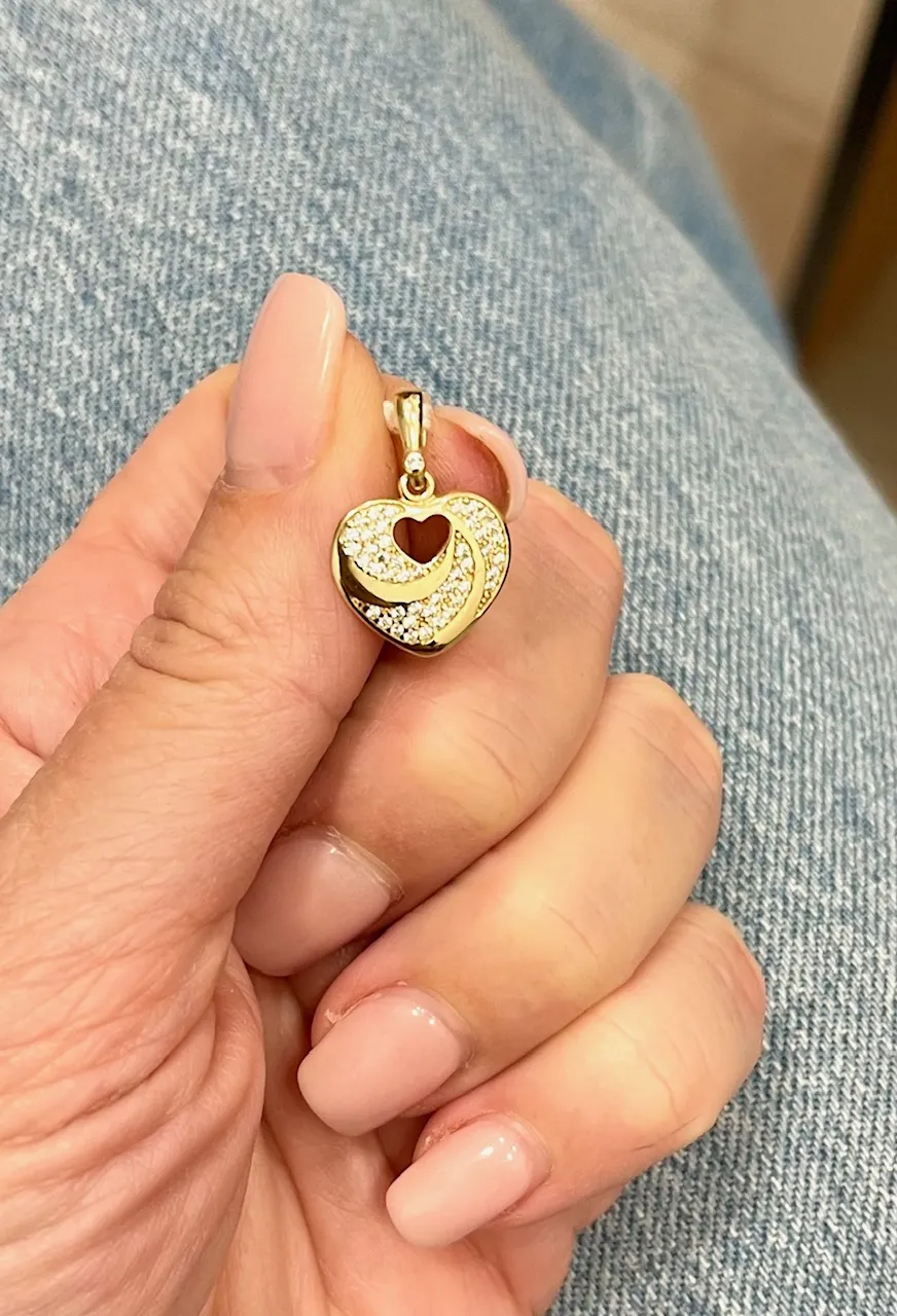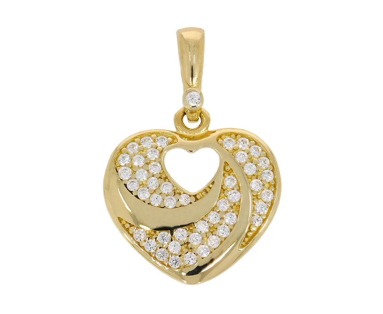 Krásny prívesok vyrobený zo žltého 14k zlata v tvare srdiečka. Šperk zdobí množstvo bielych zirkónov, ktoré dodávajú šperku neprehliadnuteľný lesk.