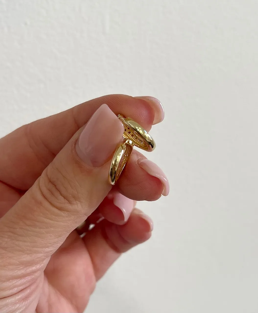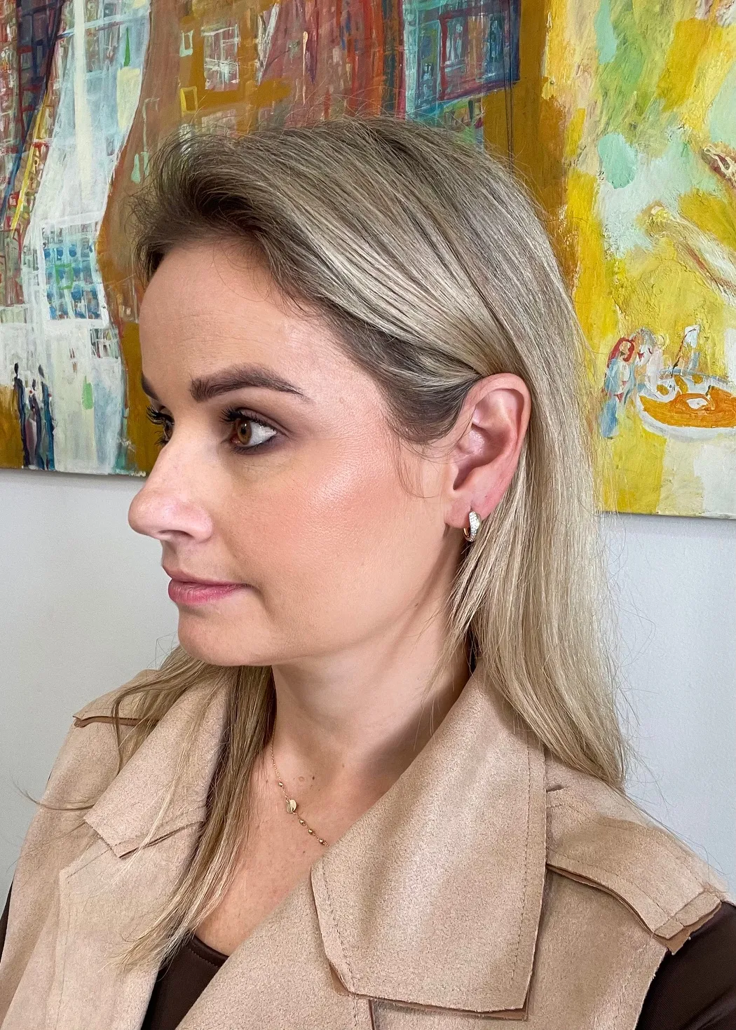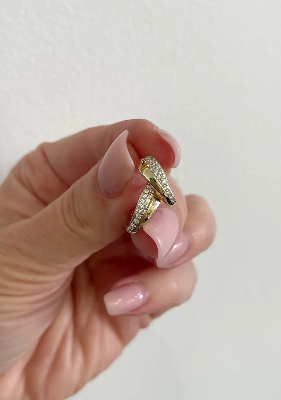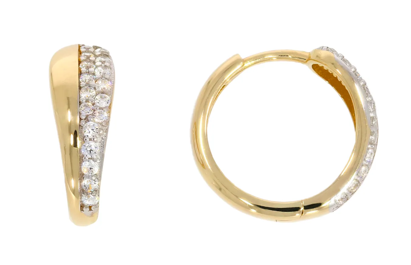 Pekné zlaté náušnice vyrobené v tvare krúžkov, ktoré obopnú ušný lalok. Náušnice sú vyrobené zo žltého 14 karátového zlata a spájajú v sebe hladkú, lesklú líniu žltého zlata a bielych zirkónov. Zadná strana šperku je hladká, lesklá.
