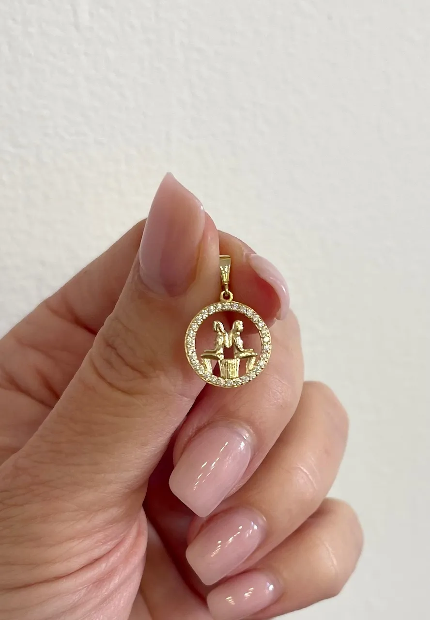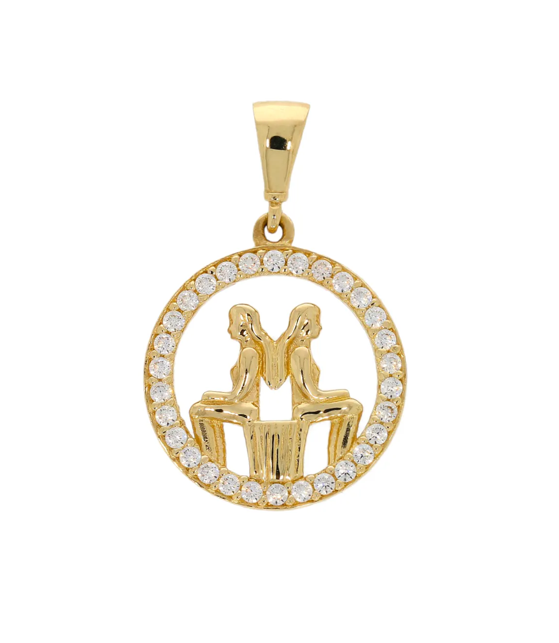Elegantný zlatý prívesok vyrobený v tvare znamenia blíženci, ktorý po obvode dekorujú biele zirkóny. Prívesok je vyrobený zo žltého 14k zlata.