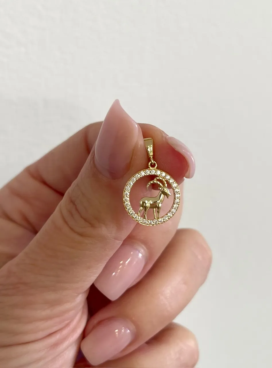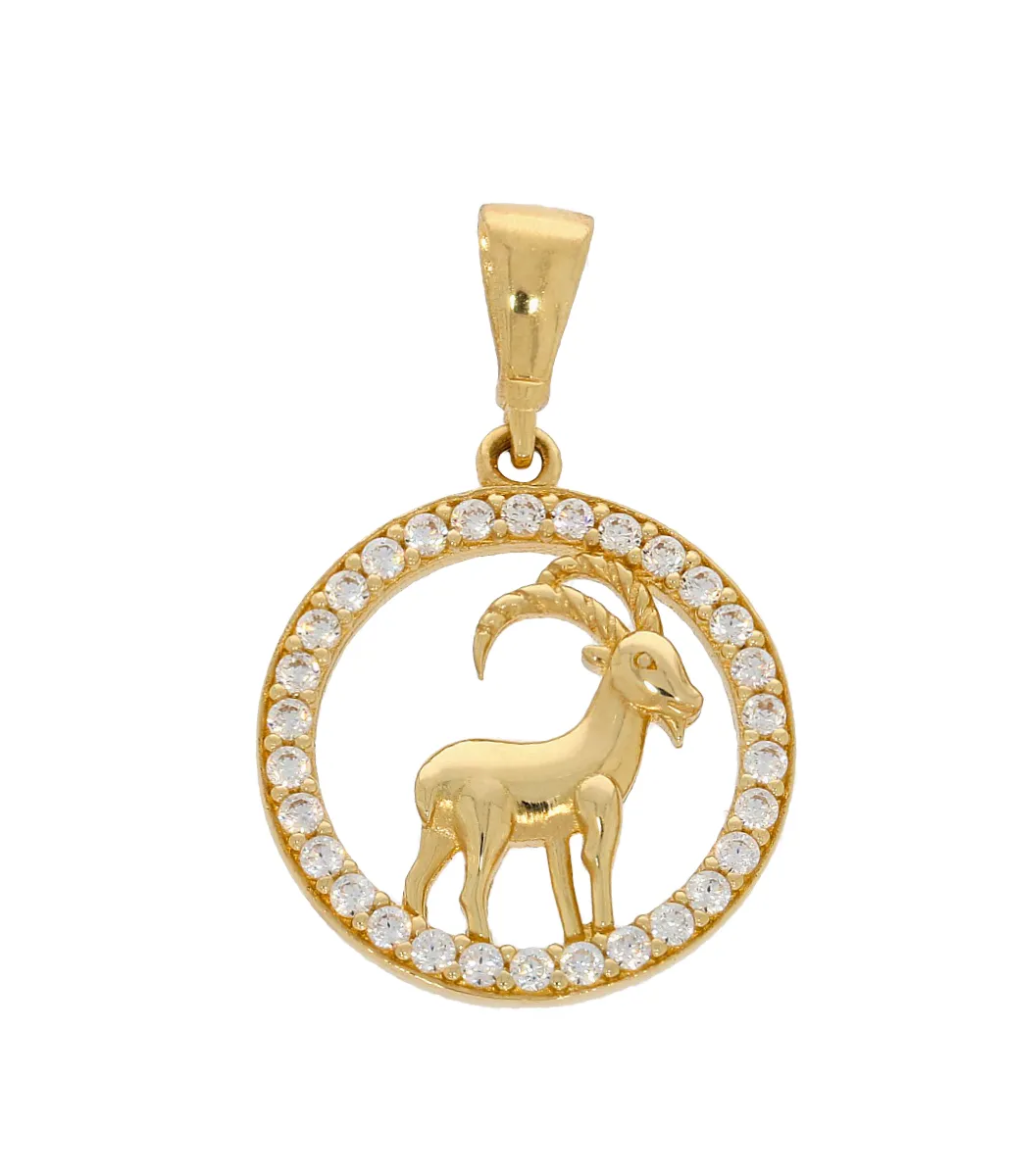 Elegantný prívesok so znamením kozorožca vyrobený zo žltého 14k zlata. Biele zirkóny uchytené po obvode šperku dodávajú prívesku krásny lesk.