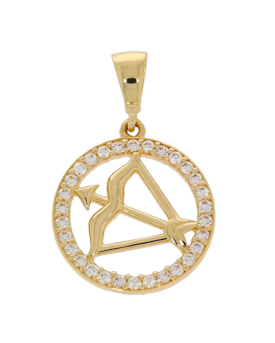Krásny, trblietavý dámsky zlatý prívesok, na ktorom je znázornené znamenie strelca. Prívesok má okrúhly tvar a je vyrobený zo žltého 14k zlata. Lesk dodávajú šperku biele zirkóny uchytené po obvode šperku.