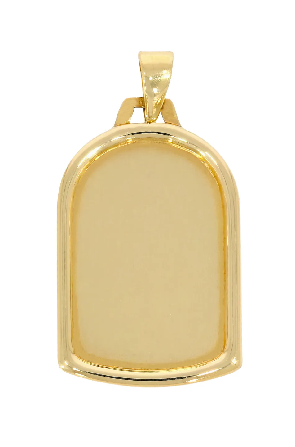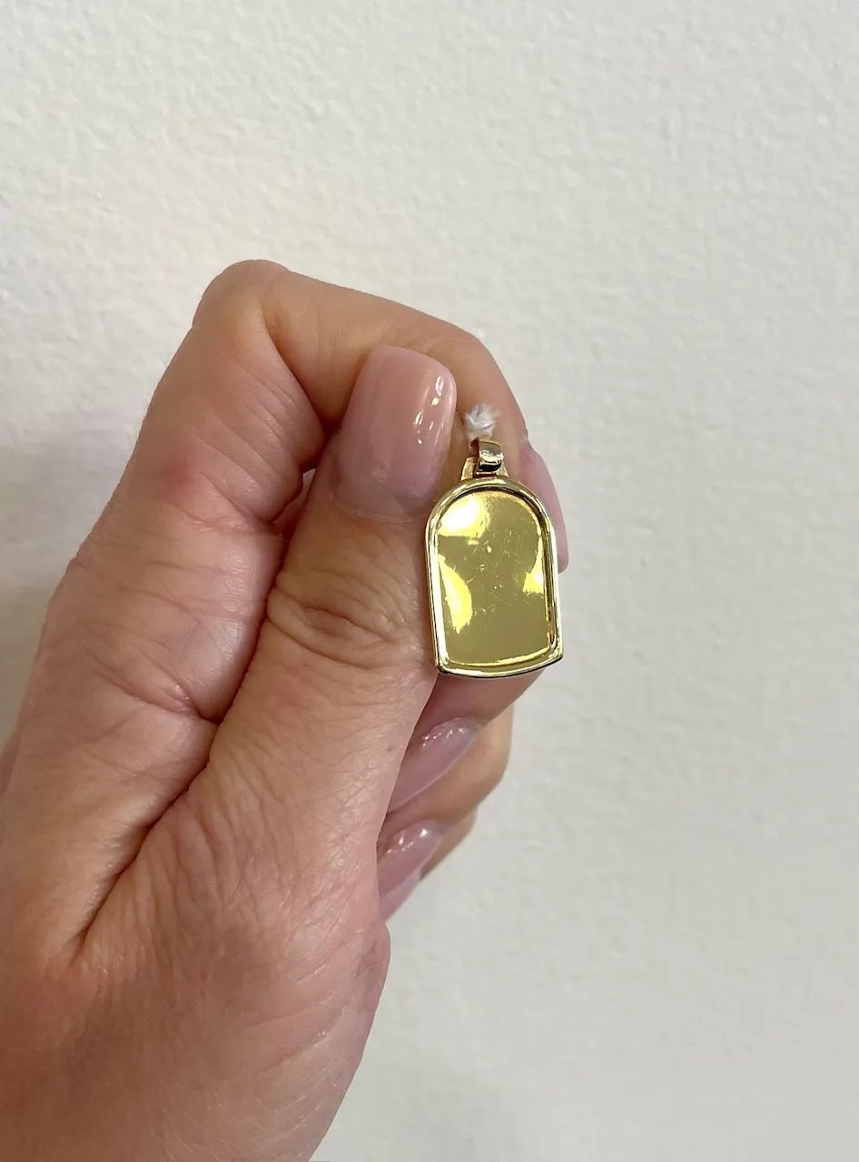 Zlatý prívesok v tvare platničky s hladkou, lesklou povrchovou úpravou. Prívesok je vyrobený zo žltého 14k zlata a je vhodný aj na gravírovanie.
