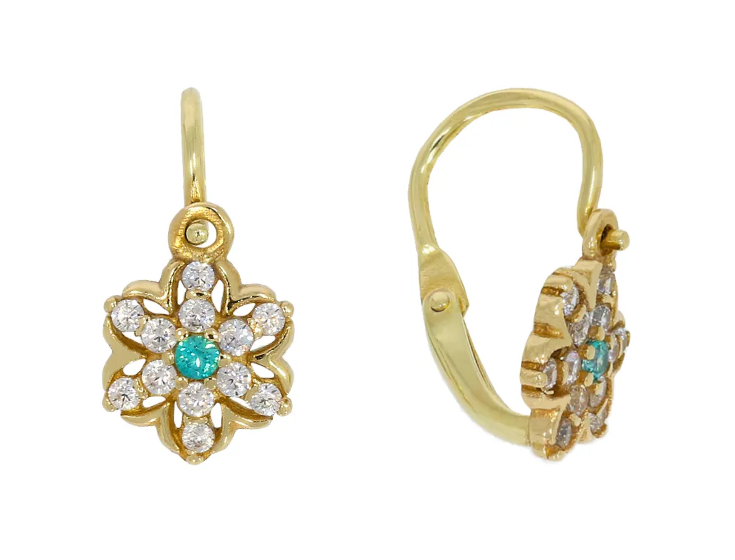 Skutočne krásne, dokonale prepracované detské zlaté náušnice v tvare kvetiny, ktoré zdobia modré a biele zirkóny. Náušnice majú bezpečné zapínanie spredu.