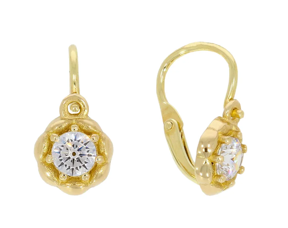 Krásne náušničky vyrobené zo žltého 14k zlata sú zdobené dominantným bielym zirkóonom. Náušnice majú bezpečné zapínanie a sú vhodné pre dievčatká už od narodenia.
