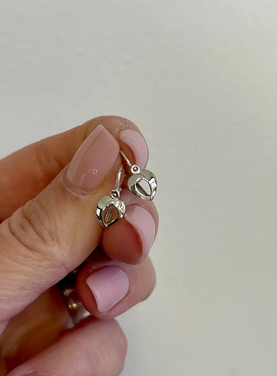 Krásne náušnice vyrobené z bieleho 14 karátového zlata v tvare srdiečok sú vďaka bezpečnému zapínaniu spredu vhodné pre dievčatká už od narodenia.