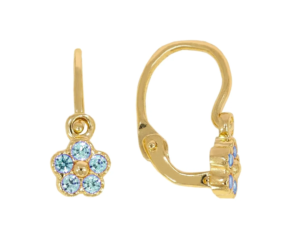 Detské zlaté náušnice v tvare kvietkov zdobia okrúhle modré zirkóny. Náušnice majú bezpečné predné zapínanie, vďaka čomu sú vhodné od útleho veku