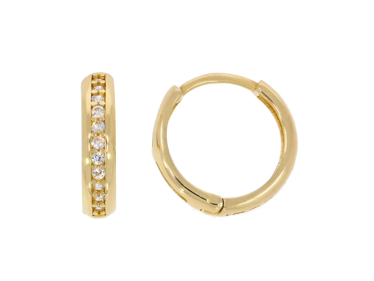 Zlaté náušnice v tvare malých krúžkov zdobia z prednej strany drobné biele zirkóny.