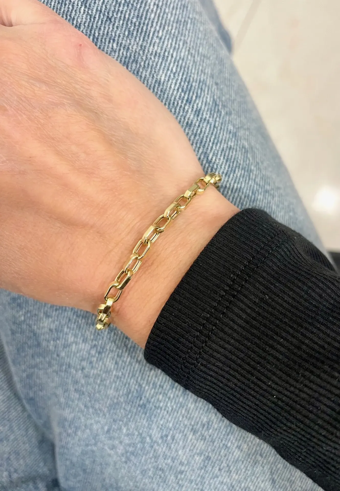 Zlatý náramok tvorený z hladkých lesklých očiek 14 karátového zlata. Náramok sa zapína na karabínku a je vhodný aj ako darček.