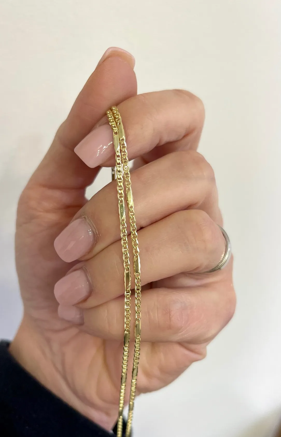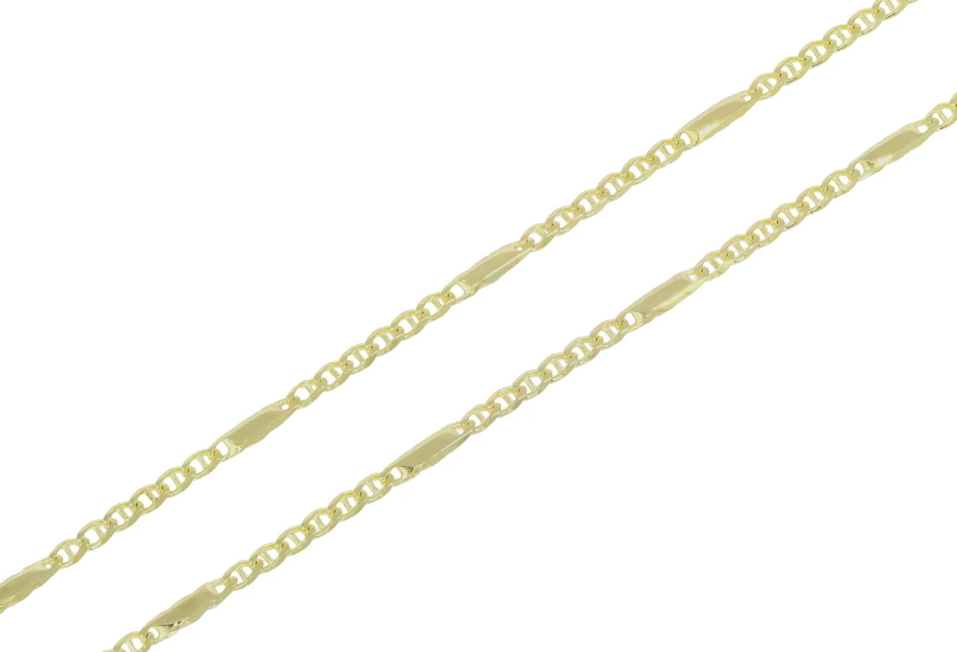 Elegantná zlatá retiazka z plných očiek zdobí niekoľko dielov pripomínajúcich drobné platničky.